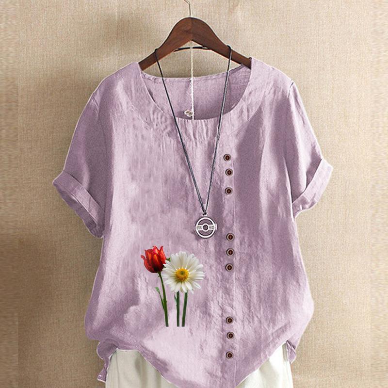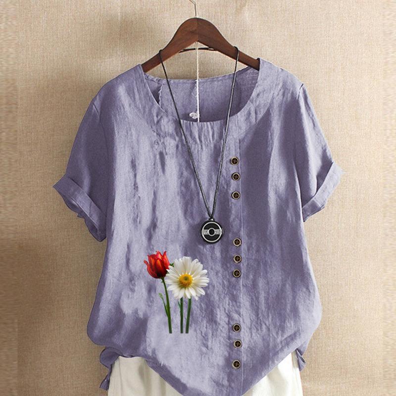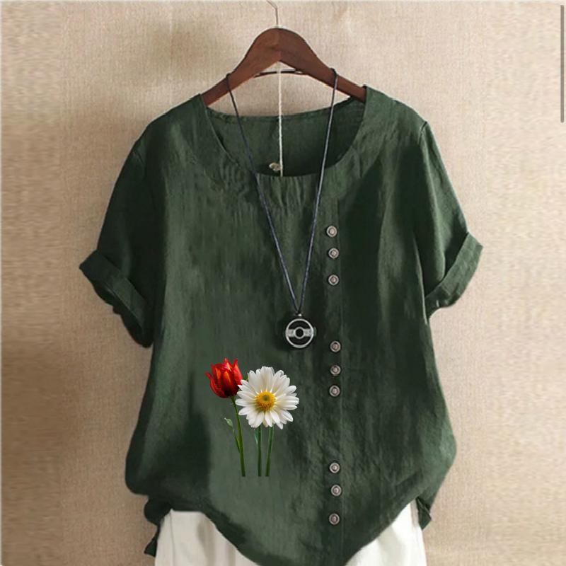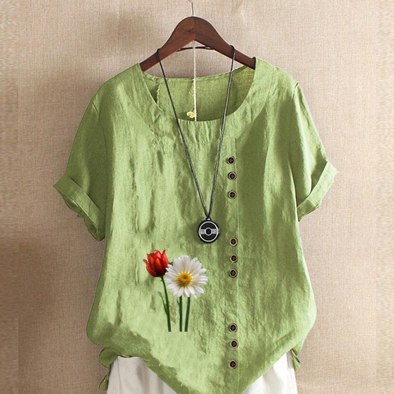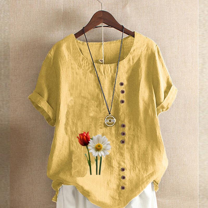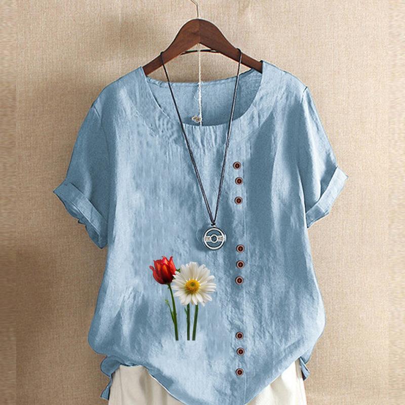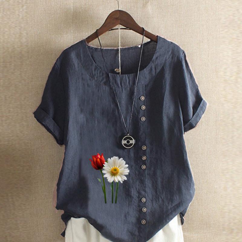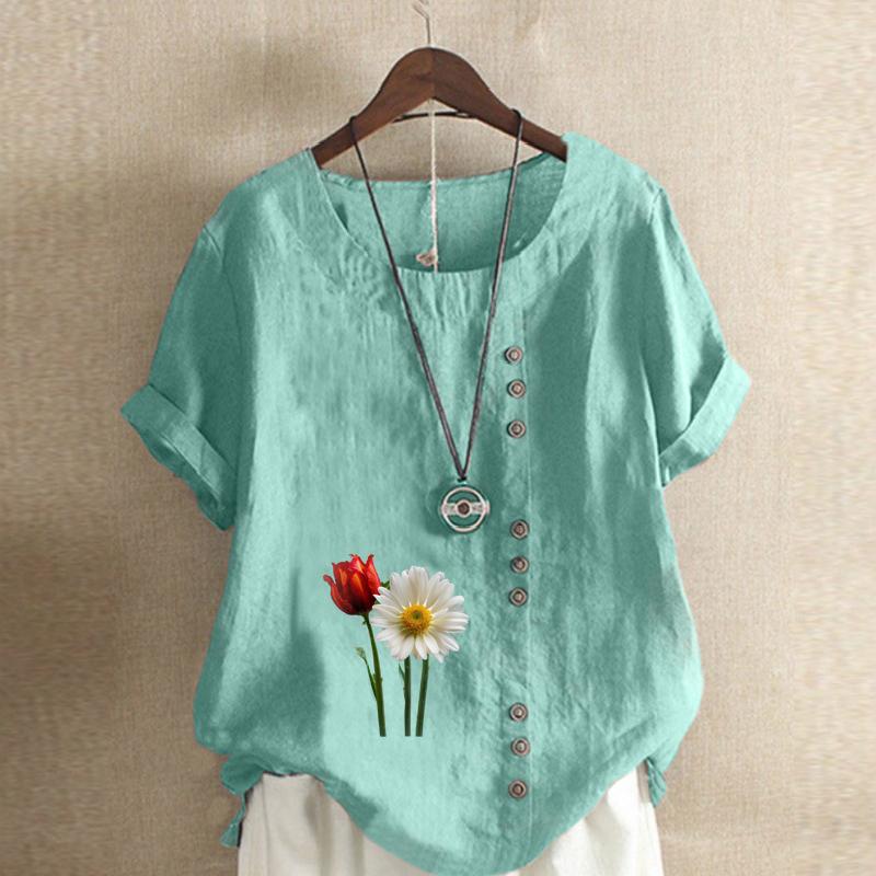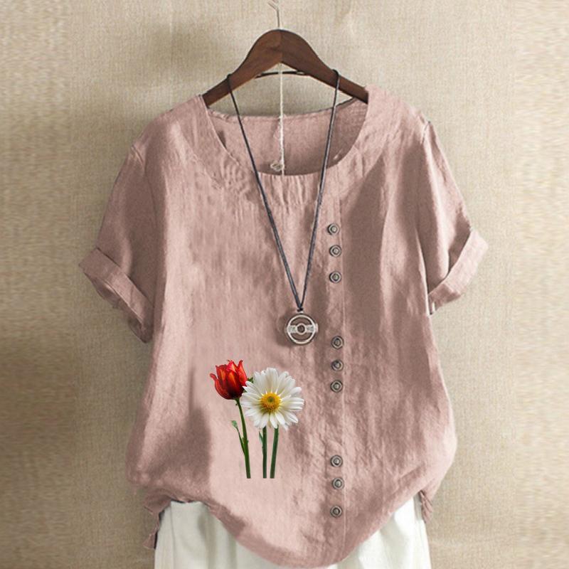 Женская мода с цветочным принтом, круглым вырезом и коротким рукавом, повседневная хлопково-льняная рубашка с рисунком, свободная летняя блузка для отдыха, топы