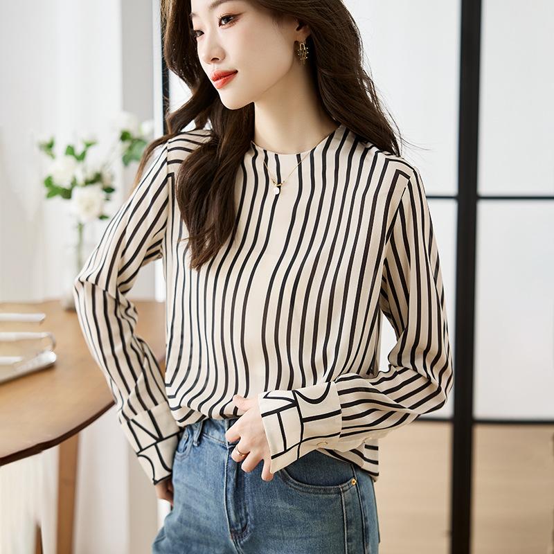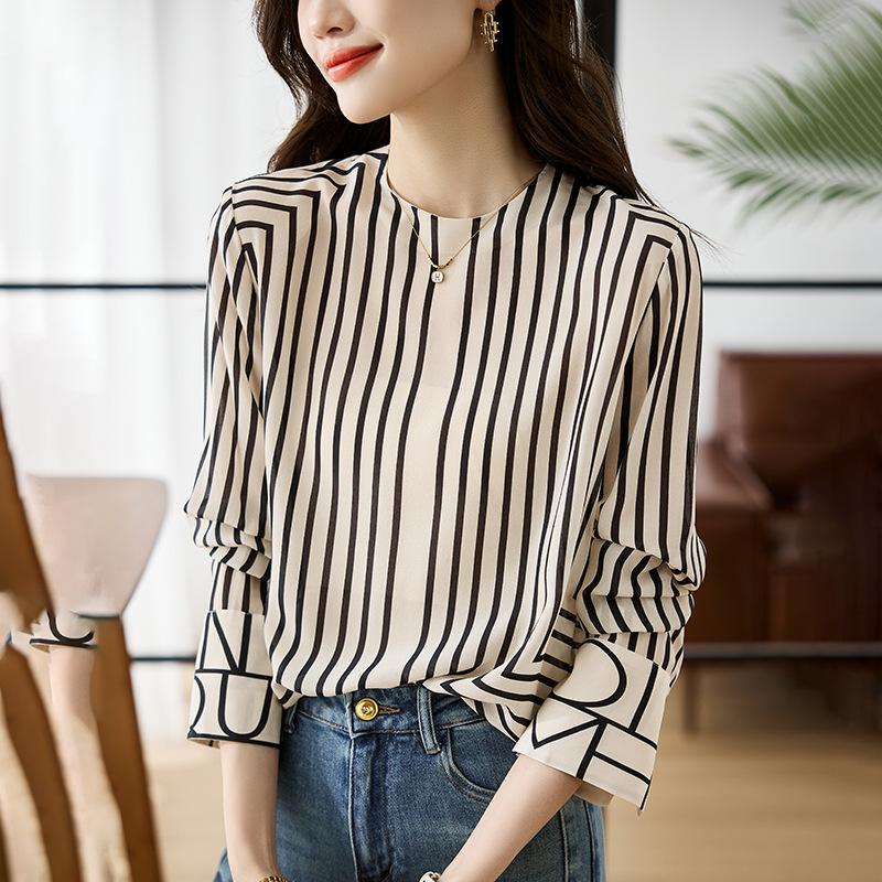 Женская весенняя рубашка в полоску с французским темпераментом, женские осенние дизайнерские элегантные топы для通勤 с круглым вырезом