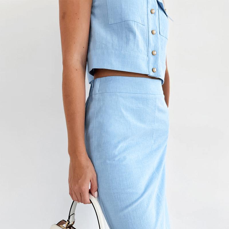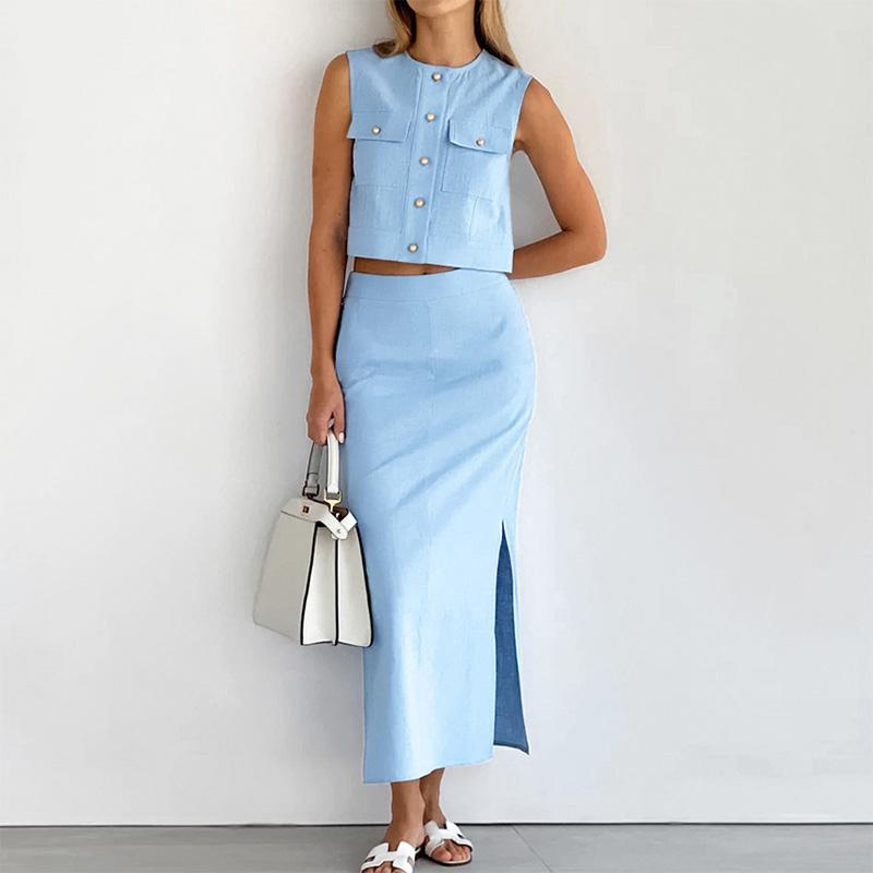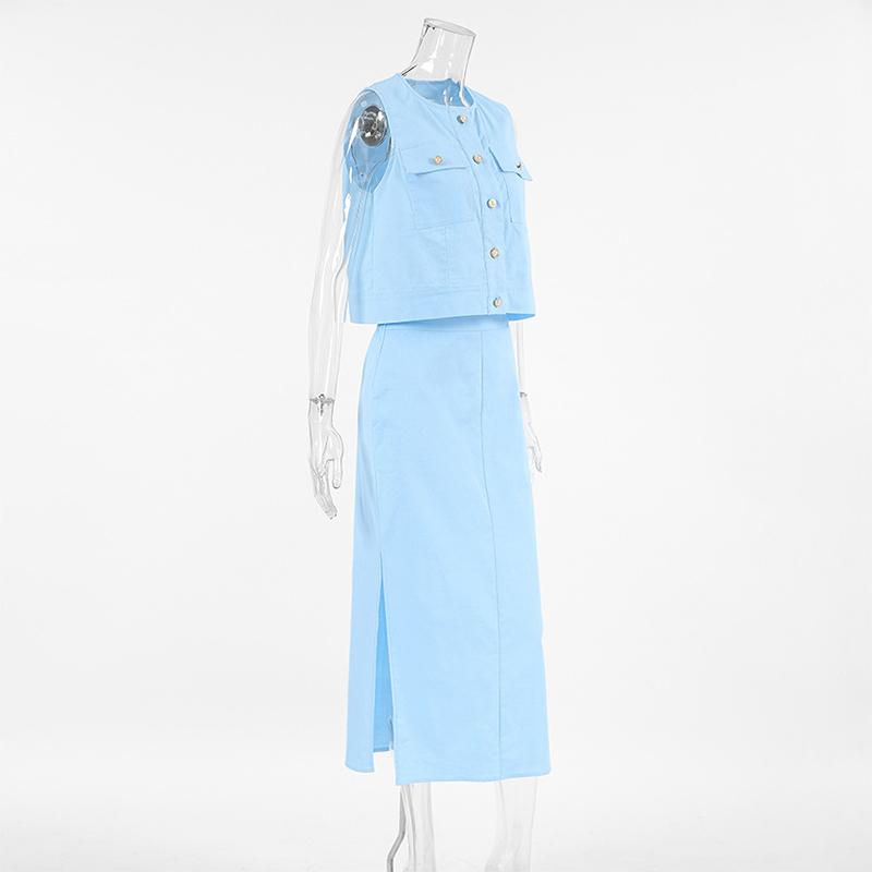 Летний уличный комплект из двух предметов для женщин с юбками, раздельные женские синие наряды без рукавов с круглым вырезом, жилет, топы, длинная юбка, костюм