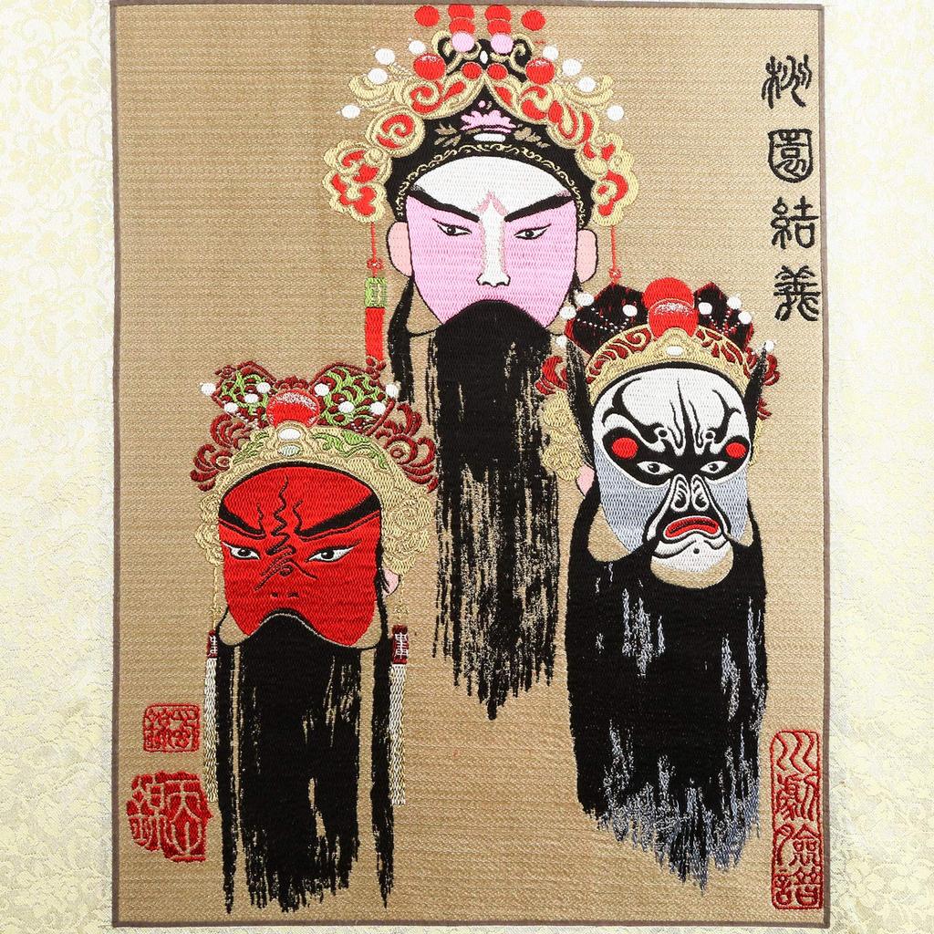 Этот висячий свиток изображает трех главных героев романа «Троецарствие», Лю Бэя, Гуань Юя и Чжан Фэя, в этом парчовом свитке Шу. Дизайн представляет собой маски трех персонажей, как их можно увидеть в Пекинской опере, и их отличительный внешний вид, который также встречается в Кабуки, очень интересен и высокохудожественен.