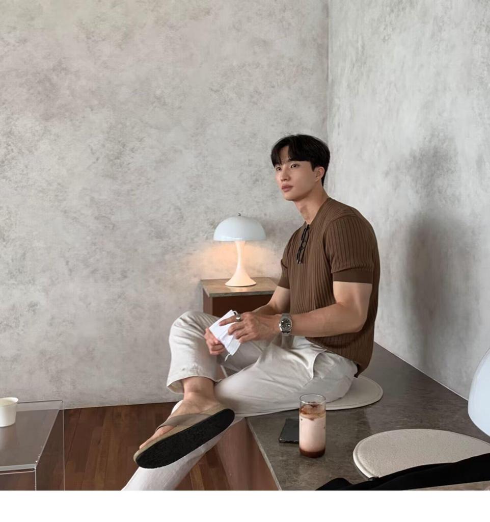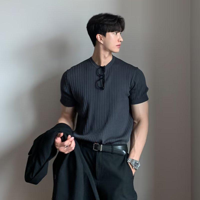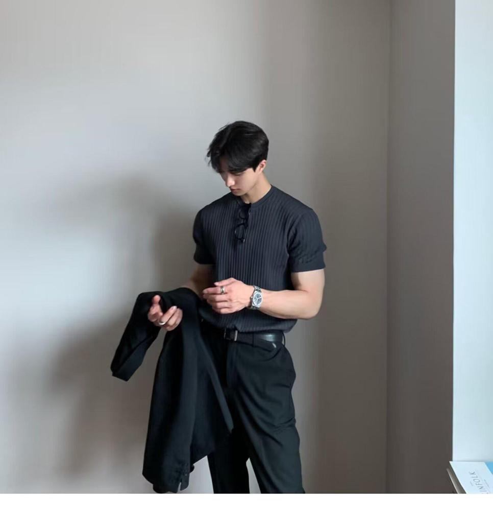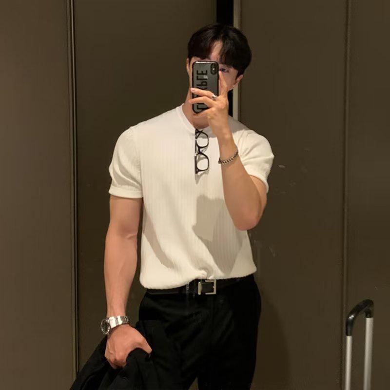 Пополните свой летний гардероб этим стильным мужским свитером с коротким рукавом, выполненным в модном корейском стиле.. Изготовлено из материала «ледяной шелк», обеспечивает прохладную и удобную посадку, идеально подходит для теплой погоды.. Свитер имеет однотонный узор и уникальный воротник-стойку, сочетая современную эстетику с классическим акцентом.. Его облегающий крой обеспечивает элегантный и модный вид для любого повседневного случая.