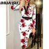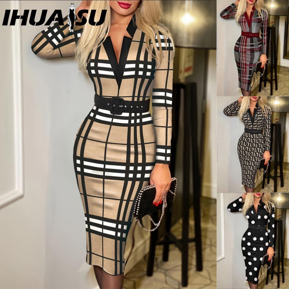 IHUASU Женская мода весенне-осенние повседневные платья с длинным рукавом и v-образным вырезом с высокой талией