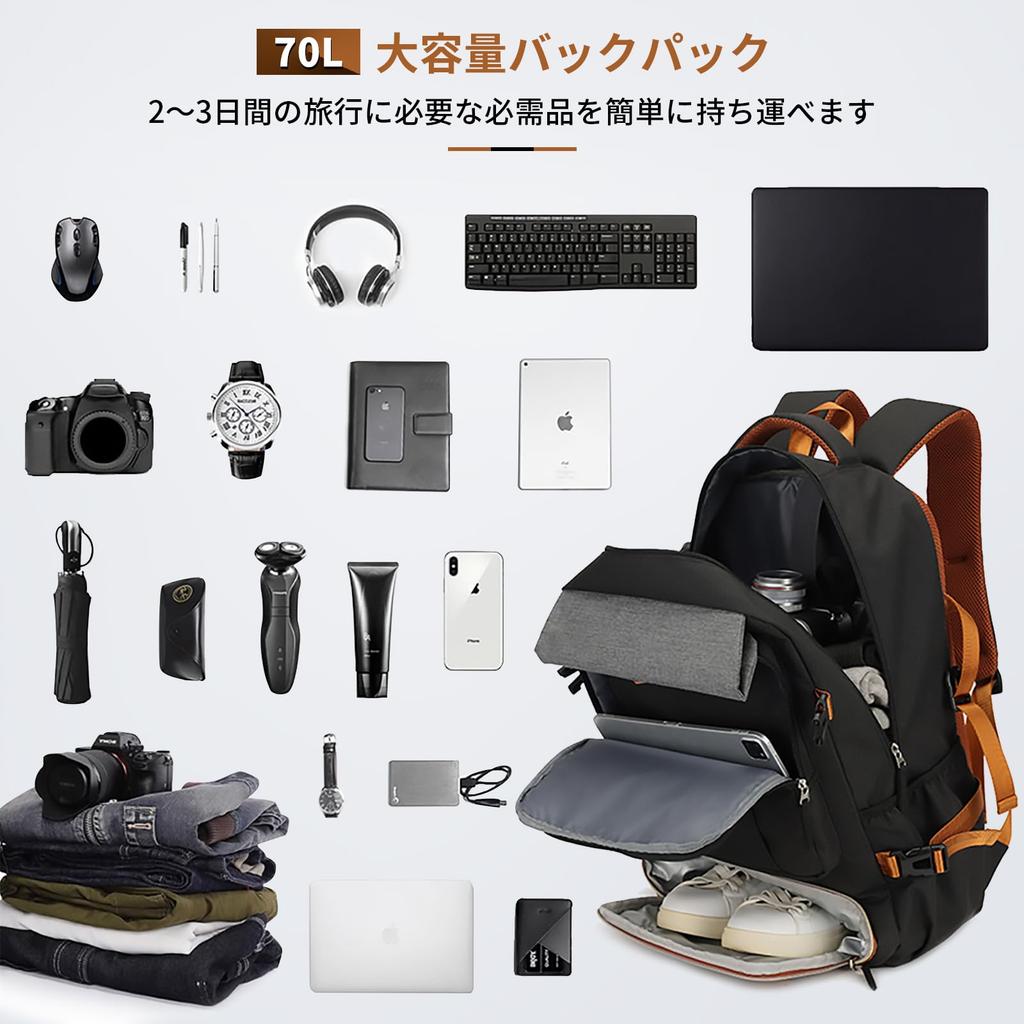 【Рюкзак большой вместимости 70 л】Этот стильный рюкзак имеет большую вместимость 70 л, достаточную для большинства дорожных нужд.. Несмотря на большую вместимость, он также имеет многофункциональные отделения для хранения вещей, включая один основной карман, два дополнительных кармана и два боковых кармана.