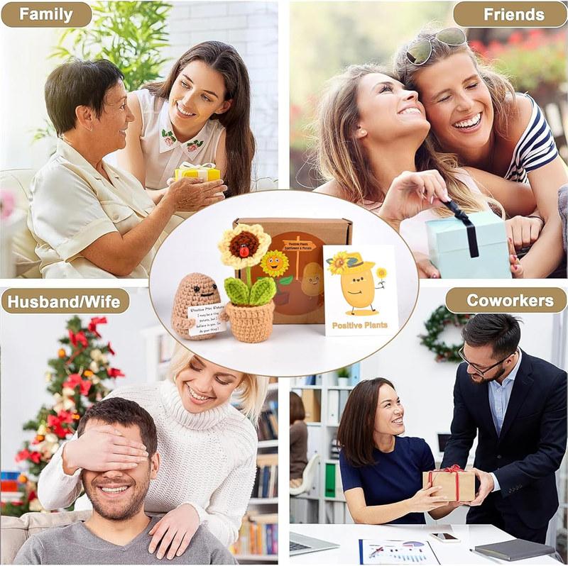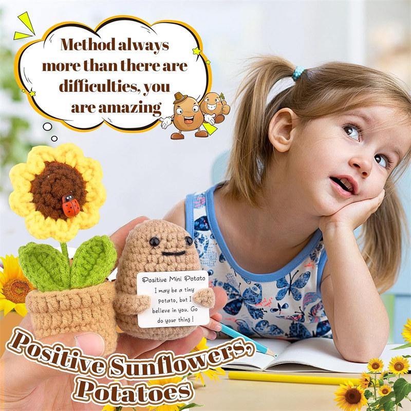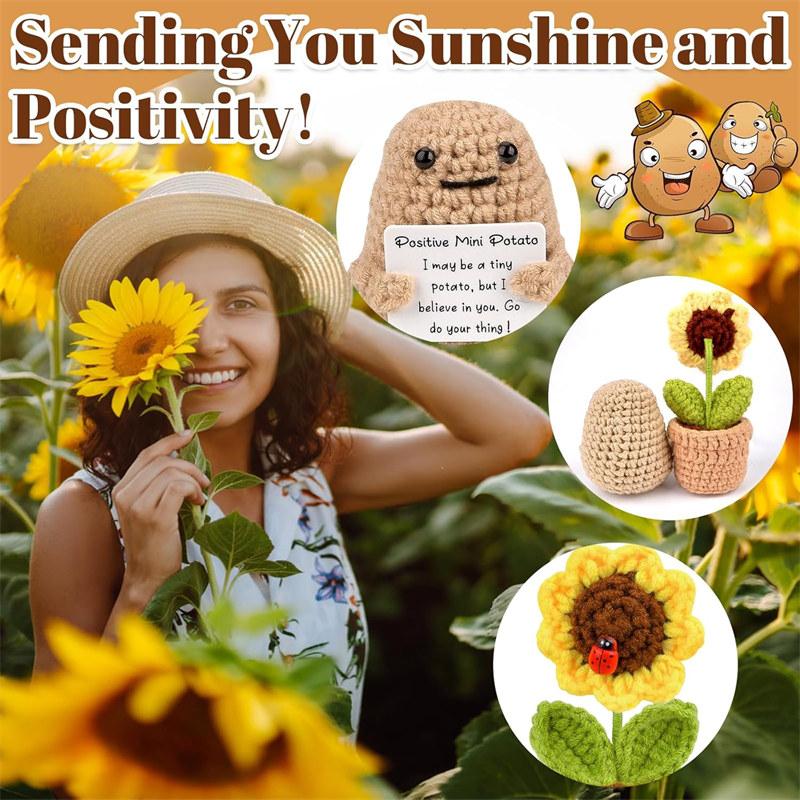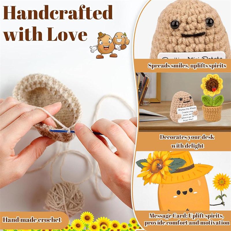 (Вязаные крючком подарки с позитивными эмоциями): Наши вязаные крючком куклы с позитивными установками способствуют позитивному мышлению и повышают уверенность в себе.. Позитивный вязаный картофельный подсолнух всегда будет сопровождать вас и поднимать настроение, независимо от того, счастливы вы или подавлены.. Наши картофель и подсолнух на удачу — это трогательные подарки, очаровательные позитивные подарки, призванные поднимать настроение и вдохновлять.