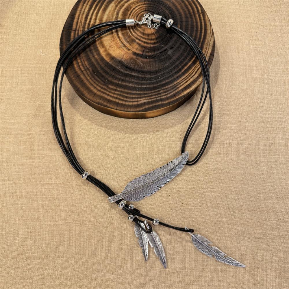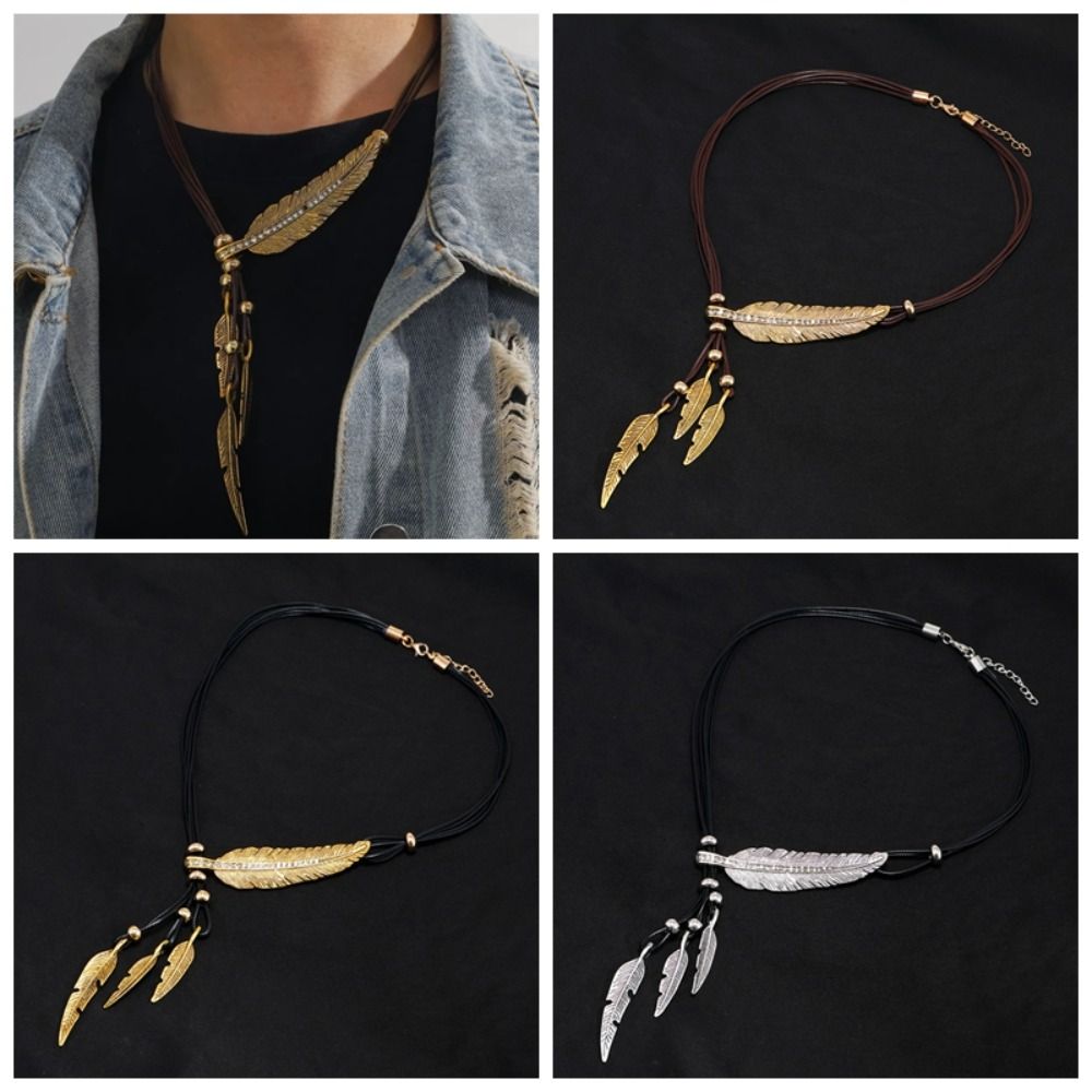 Ожерелье из кожи и стразов с кисточками из цинкового сплава с листьями, кулон на шею с золотым пером, подарок