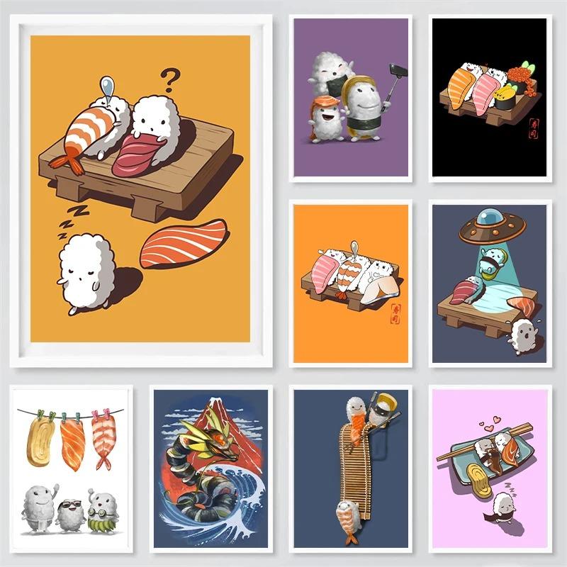 Суши-еда мультфильм картина плакат холст печать суши милая иллюстрация настенное искусство картина кухня японская еда настенный декор