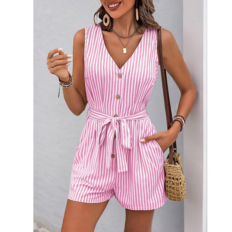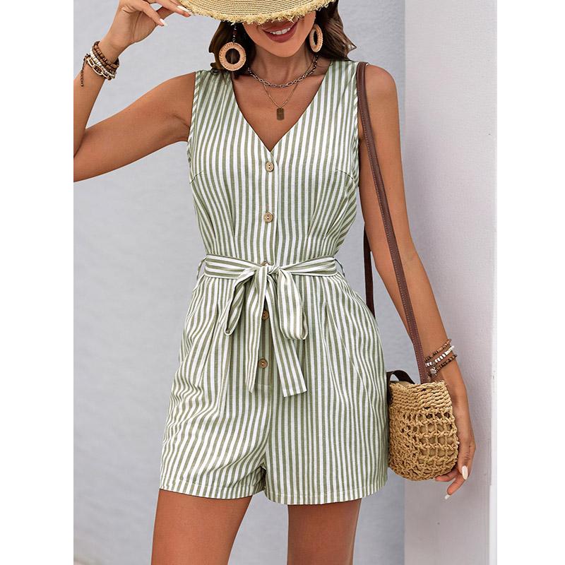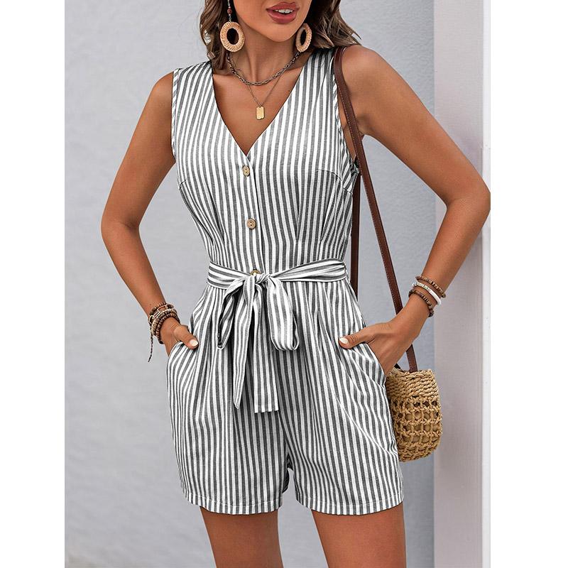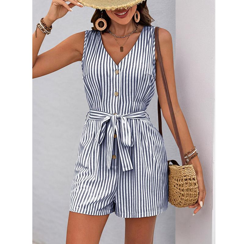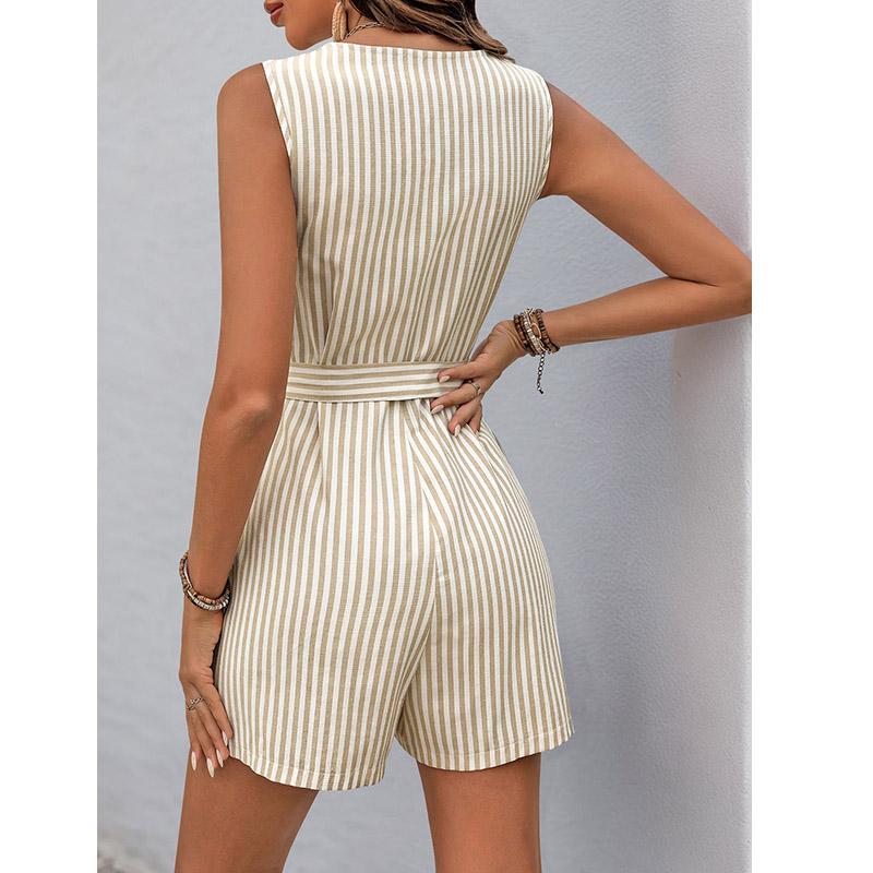 Женский комбинезон-шорты с V-образным вырезом без рукавов в полоску со шнуровкой