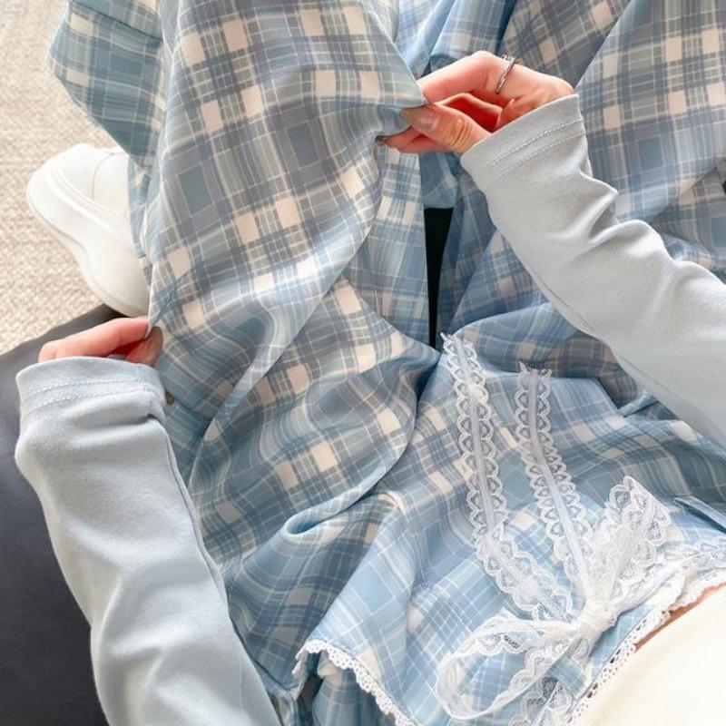 Кружевные брюки свободного кроя с широкими штанинами в корейском стиле для женщин Весна/Лето Синие клетчатые длинные брюки Ленивые облегающие повседневные брюки