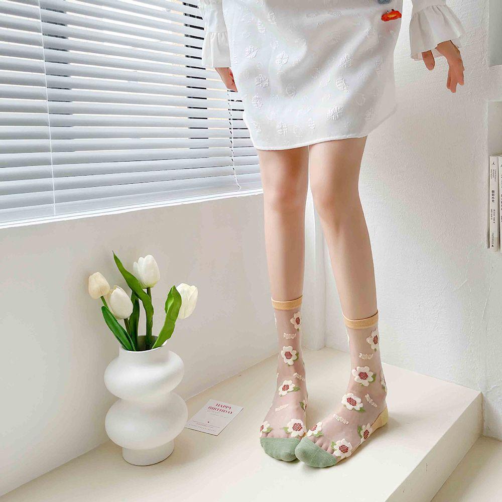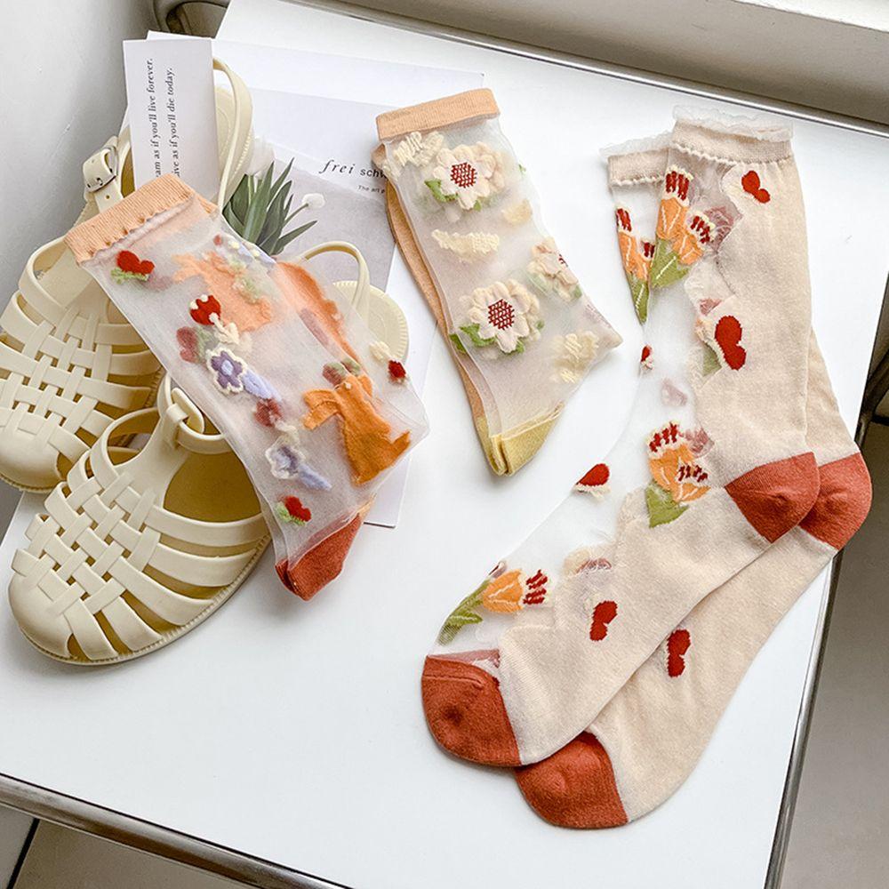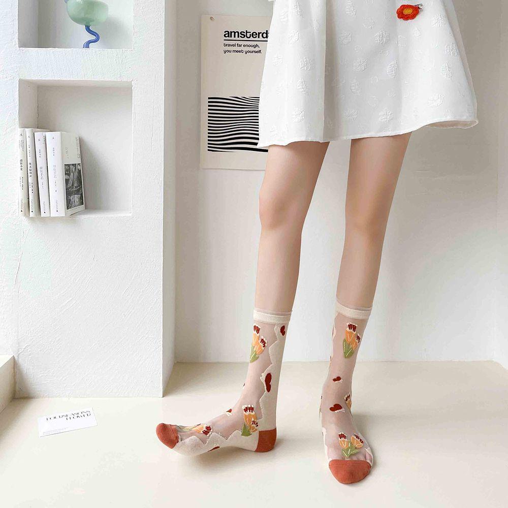 Летние носки в японском стиле из нежного шелка, женские носки средней длины с цветочным узором