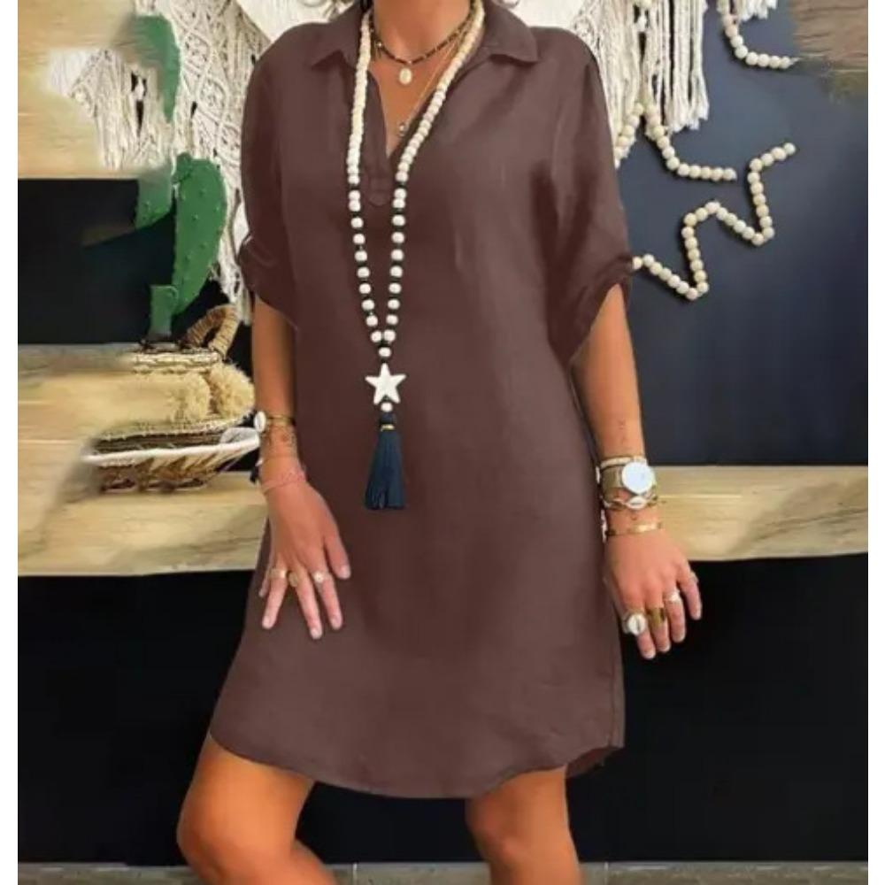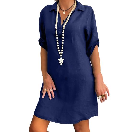 Женская хлопковая рубашка с коротким рукавом, юбка, однотонная льняная, отложной воротник, свободное платье-рубашка
