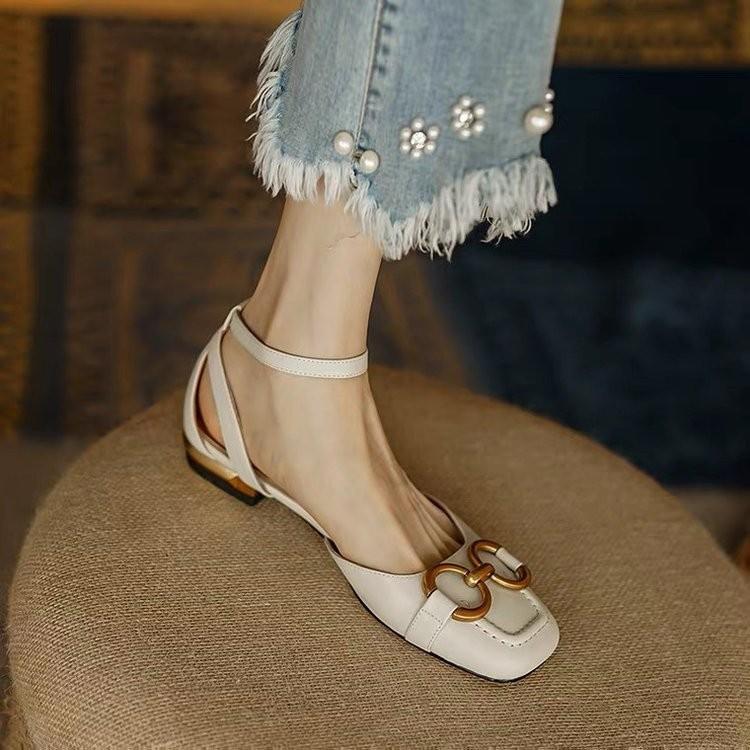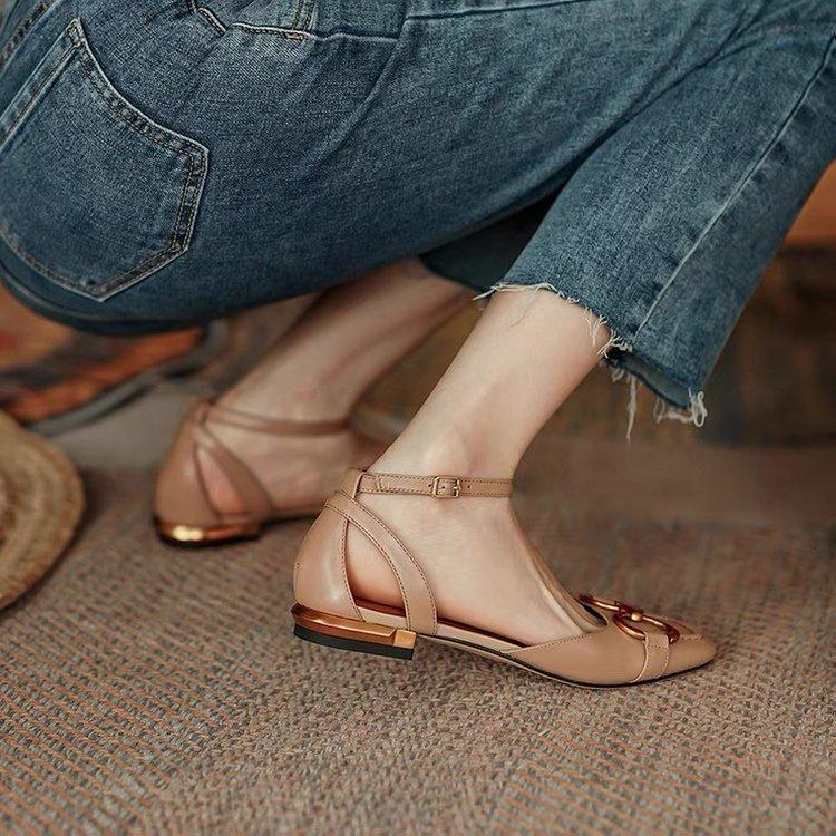 Ретро металлическая пряжка сумка голова полые сандалии женские низкий каблук 2024 лето квадратный носок матовые универсальные балетки с пряжкой