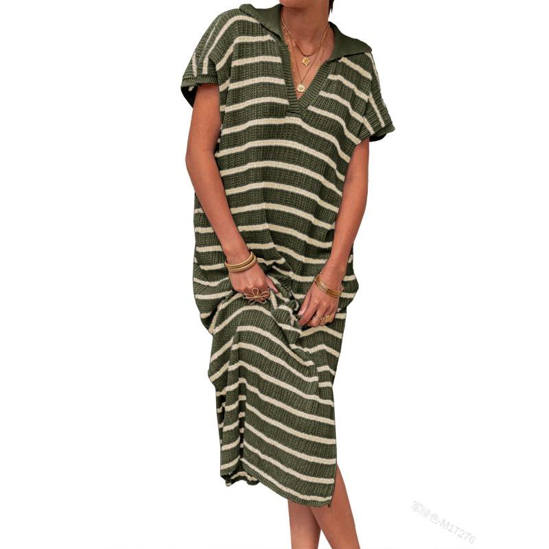 Летнее женское платье с V-образным вырезом, полосатым глубоким разрезом, лацканами, длинный свитер