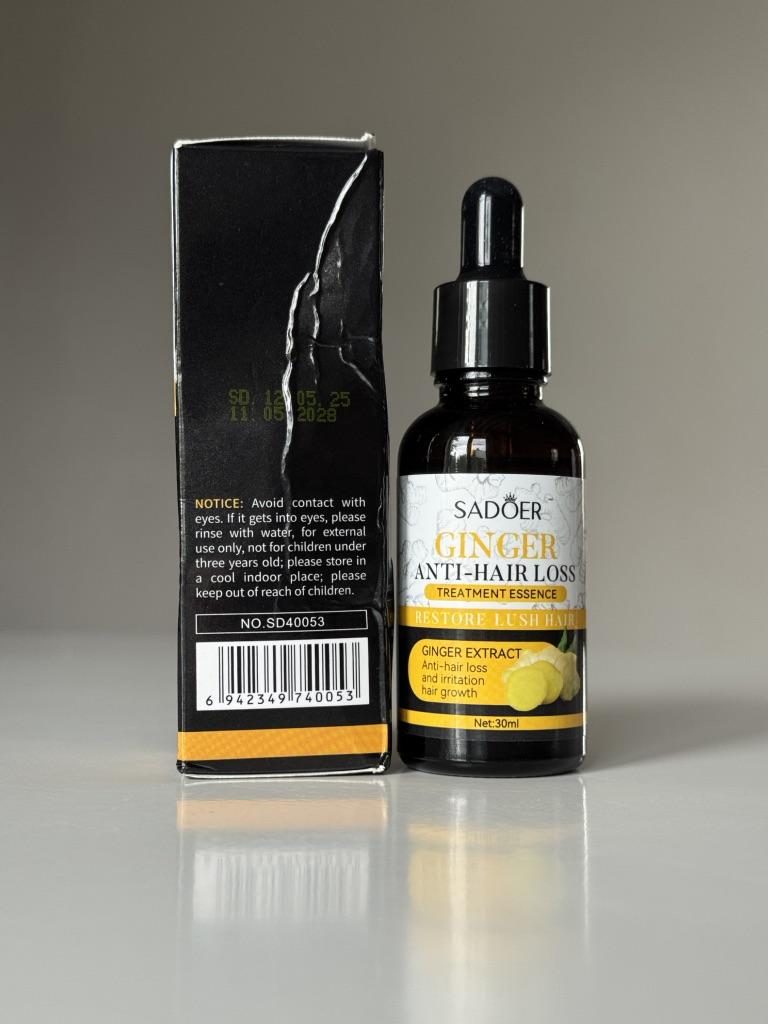 Эссенция для лечения выпадения волос с имбирём SADÖER 🔥 Содержит эссенцию против выпадения волос и для роста волос, капли эссенции легко впитываются, увлажняют и активизируют волосяные фолликулы, стимулируя рост волос, укрепляя корни и фиксируя волосы, уменьшая их выпадение и делая волосы густыми, сильными и эластичными. Способ применения: Возьмите необходимое количество этого средства и нанесите его на волосы, массируйте пальцами в течение 2-3 минут. Можно использовать 1-2 раза в день. Состав: Вода, бутиленгликоль, феноксиэтанол, гидрогенизированное касторовое масло peg-40, гидроксиэтилцеллюлоза, метилпарабен, поликватерниум- 10, дикалийглицирризат, токоферилацетат, peg-10, отдушка, экстракт корня имбиря лекарственного (zingiber officinale), экстракт корня софоры узколистной, динатрийфосфат, полисорбат 60, токоферол, натрий-имбирное противовоспалительное средство. Объём: 30 мл. Доставка около месяца. Трек-номер отслеживался. К покупке рекомендую 👍
