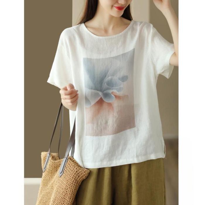 Футболка с короткими рукавами из хлопка и льна с принтом в стиле ретро, литературная тематика. Летний свободный и облегающий повседневный и универсальный топ-пуловер.
