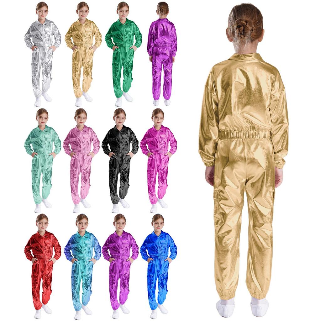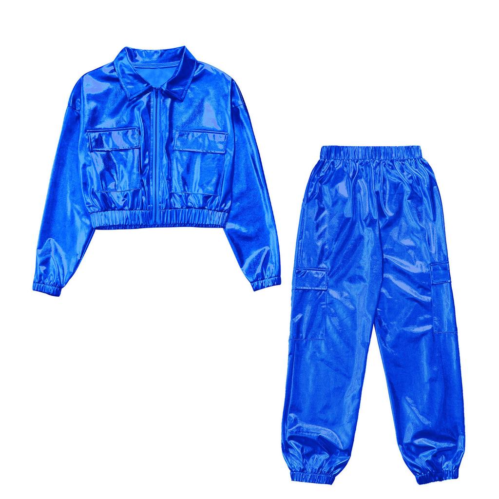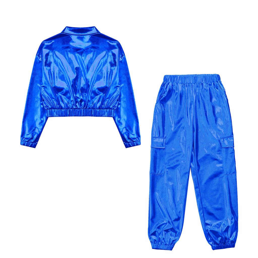 Детская блестящая куртка унисекс с металлическим оттенком, с длинными рукавами, с блестящими брюками, одежда для выступлений в стиле хип-хоп