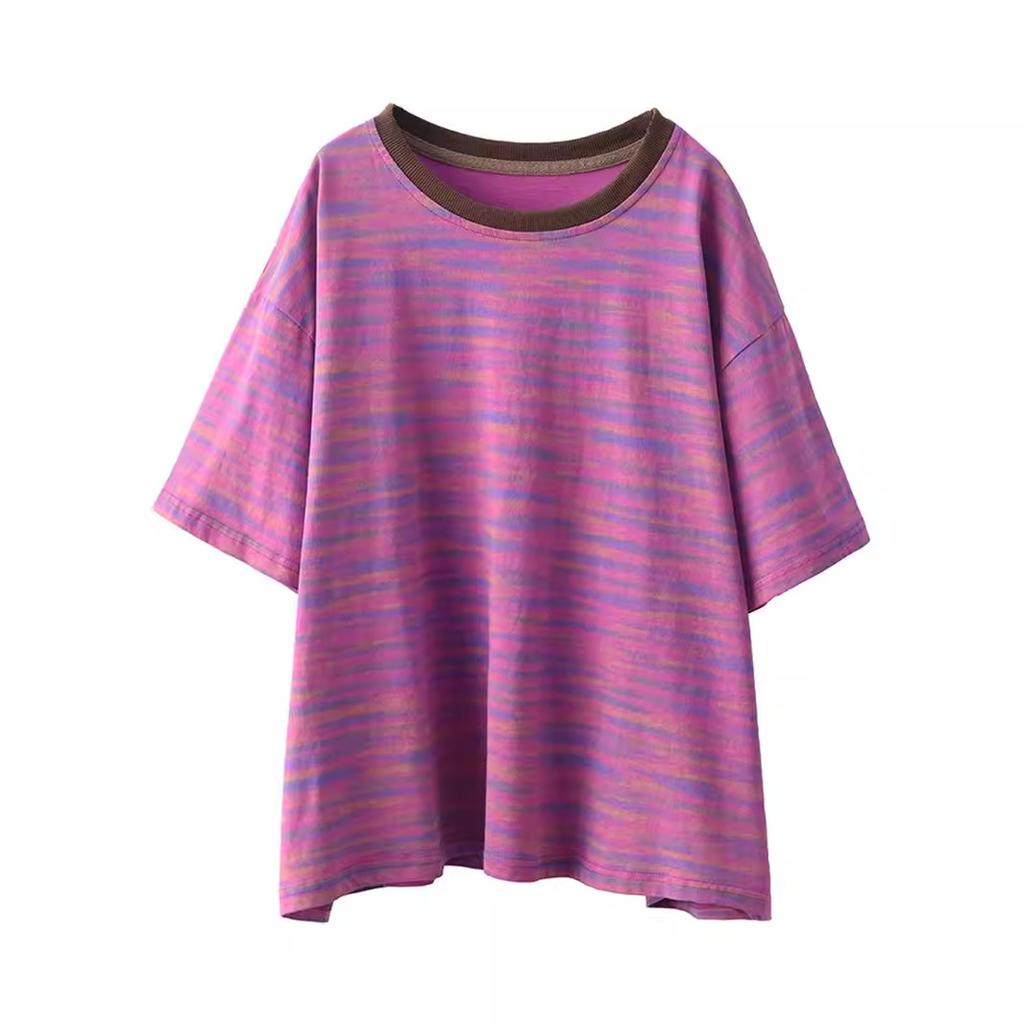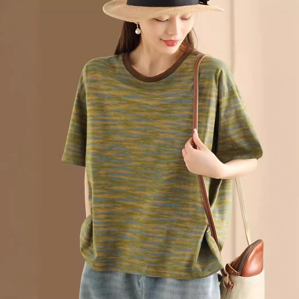 Новый стиль литературной ретро женской футболки с короткими рукавами летом свободный пуловер полосатый универсальный повседневный топ, закрывающий живот