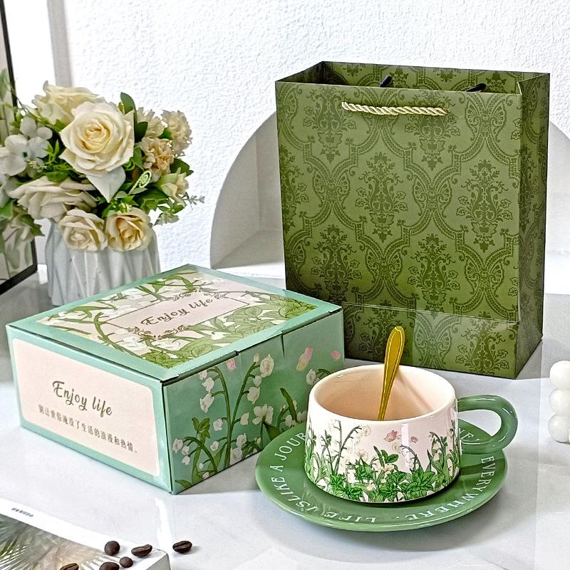 Ретро керамические чашки и блюдца, старинная картина маслом, зеленый ландыш, кофейная чашка и блюдце, послеобеденный чай в стиле Хепберн
