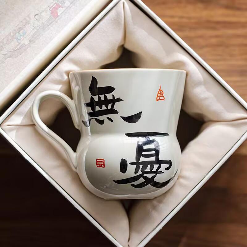 Растительная зола Керамика Рукописный текст Тыквообразная Офисная чашка для воды Питьевая вода с ложкой Креативная бытовая Гочао