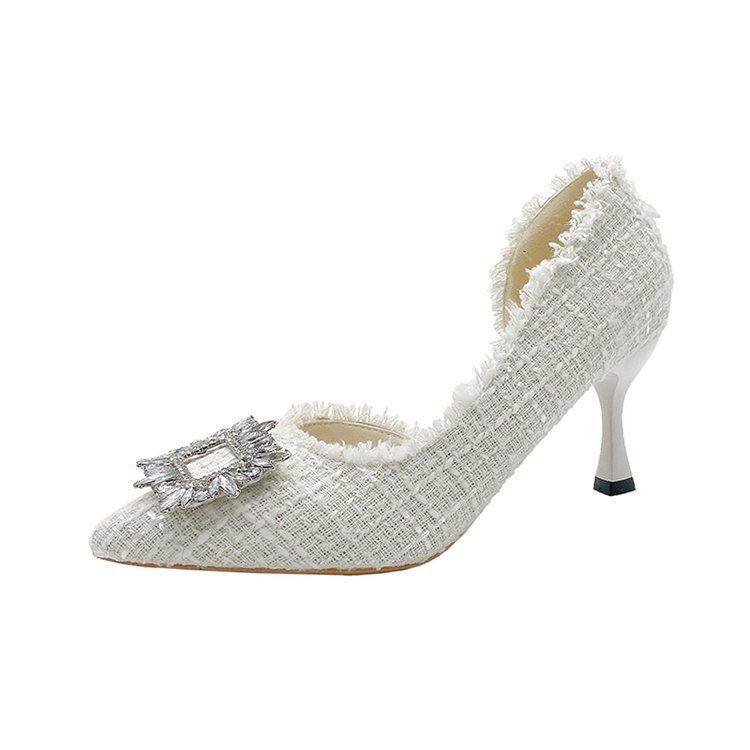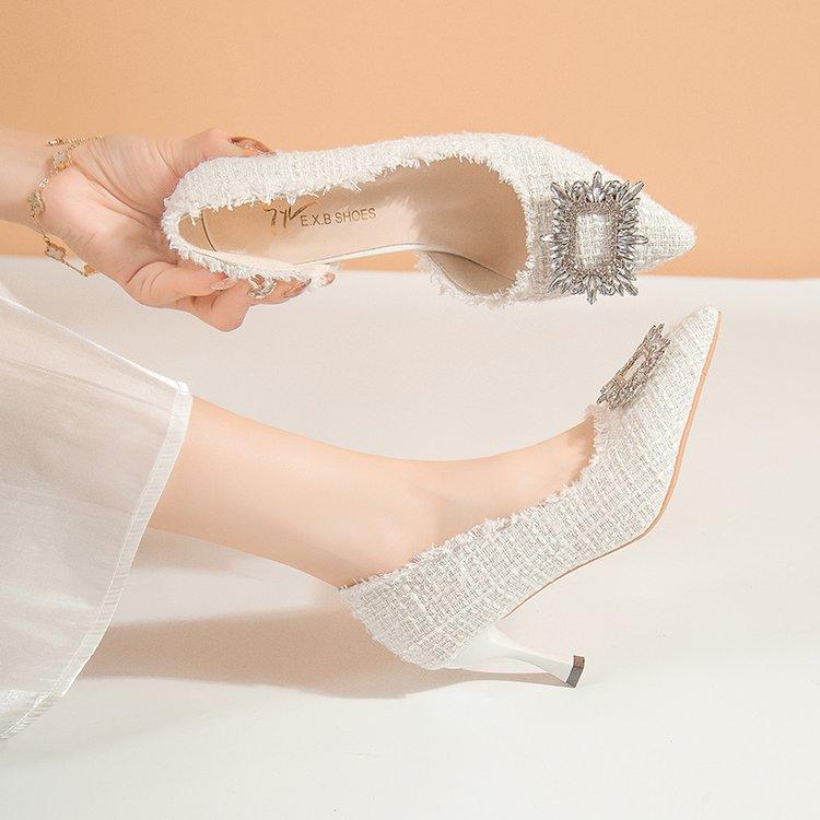 Женские туфли на высоком каблуке лето 2024 новый нишевый дизайн французские туфли-лодочки тонкий каблук маленькие ароматные туфли с одиночными стразами