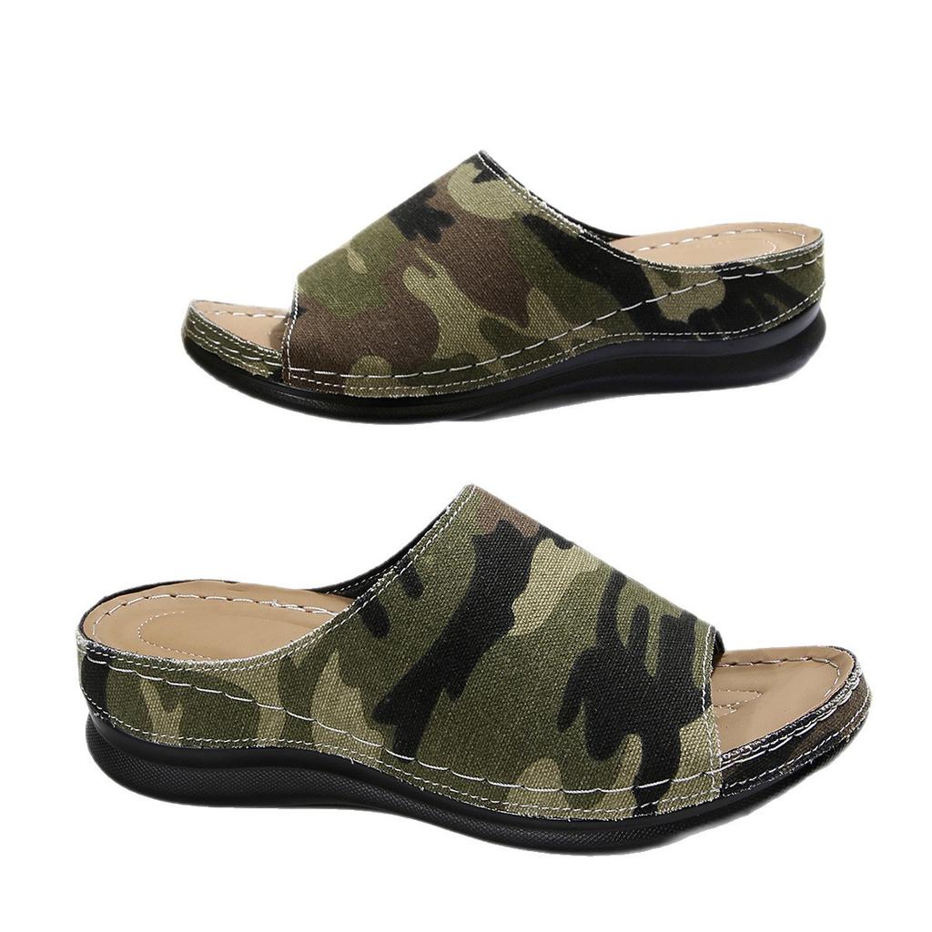 Большого размера шлепанцы с открытым носком 2025 лето новые сандалии носить рыбий рот камуфляж на одной педали танкетка шлепанцы женские