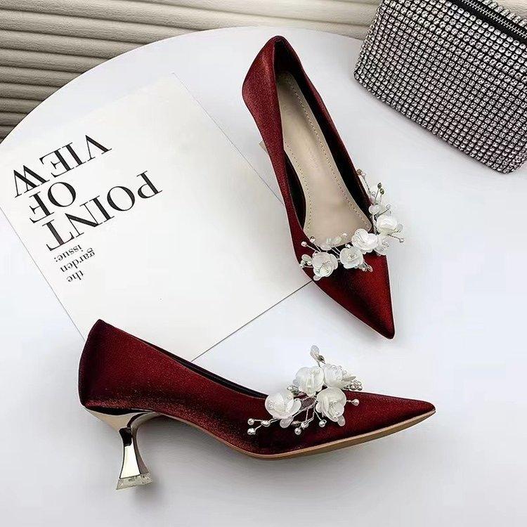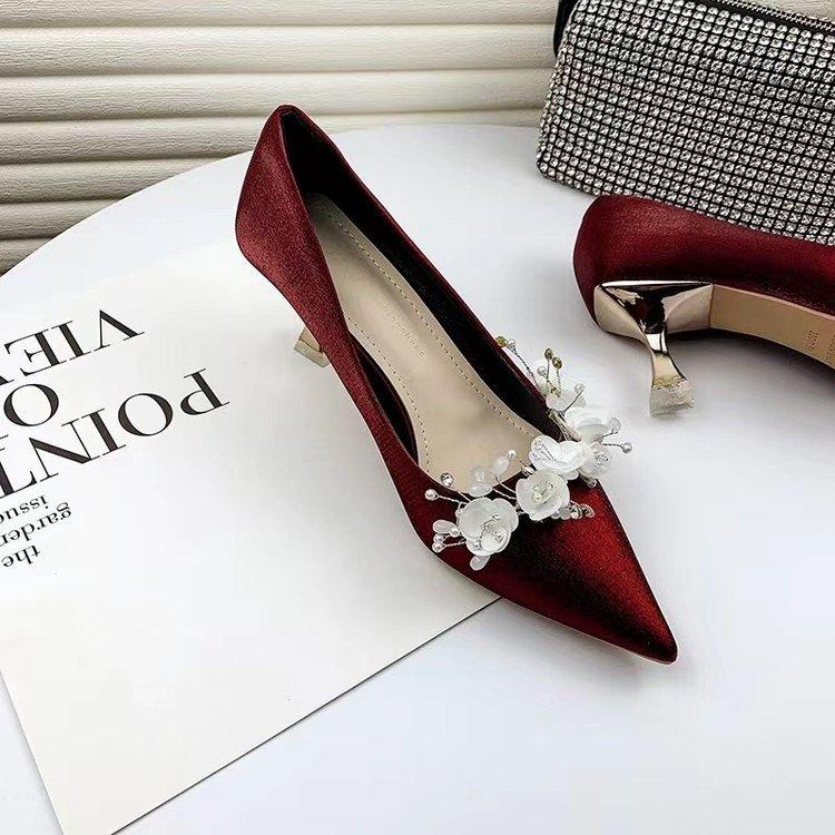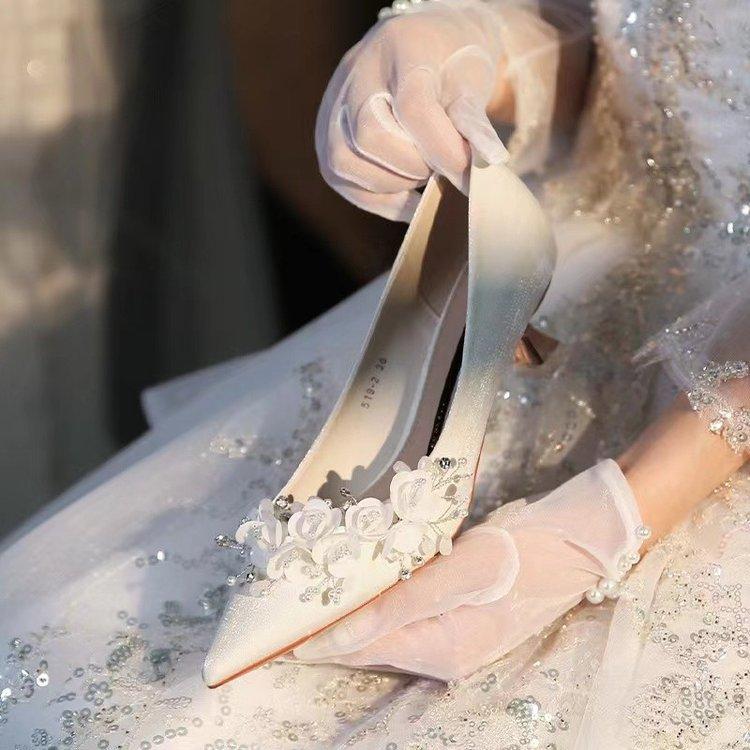 2024 новое французское свадебное платье основная свадебная обувь женские тонкие каблуки острый носок светлый рот белые цветы атласные свадебные туфли на высоком каблуке
