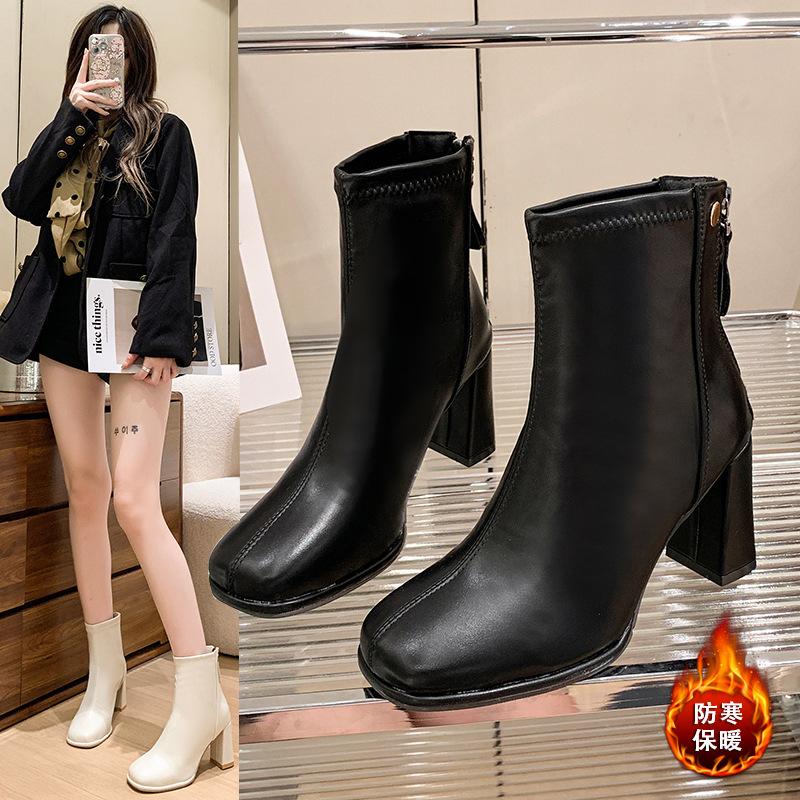 Женские короткие сапоги на высоком толстом каблуке, новые сапоги 2024 года, белые, с французским квадратным носком, осенне-зимние короткие сапоги, модные сапоги с низким голенищем, тонкие сапоги