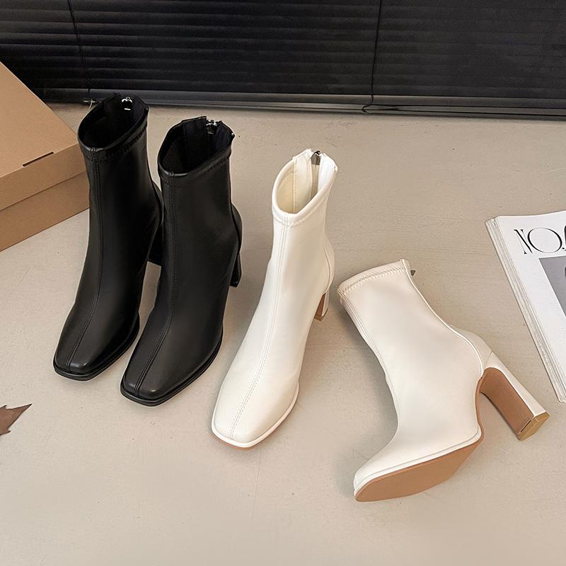 Внешнеторговые универсальные ботинки женские 2024 новые корейская версия белый темперамент толстый каблук короткие ботинки осень и зима французский высокий каблук тонкие ботинки