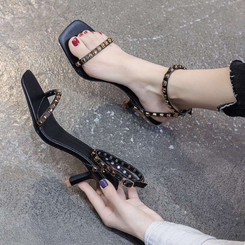 Босоножки с заклепками женские летние на среднем каблуке 2024 новые универсальные туфли-стилеты в римском стиле ins тренд интернет-знаменитость профессиональные туфли на высоком каблуке
