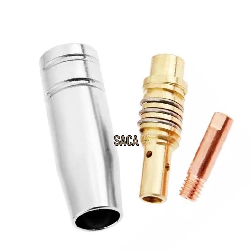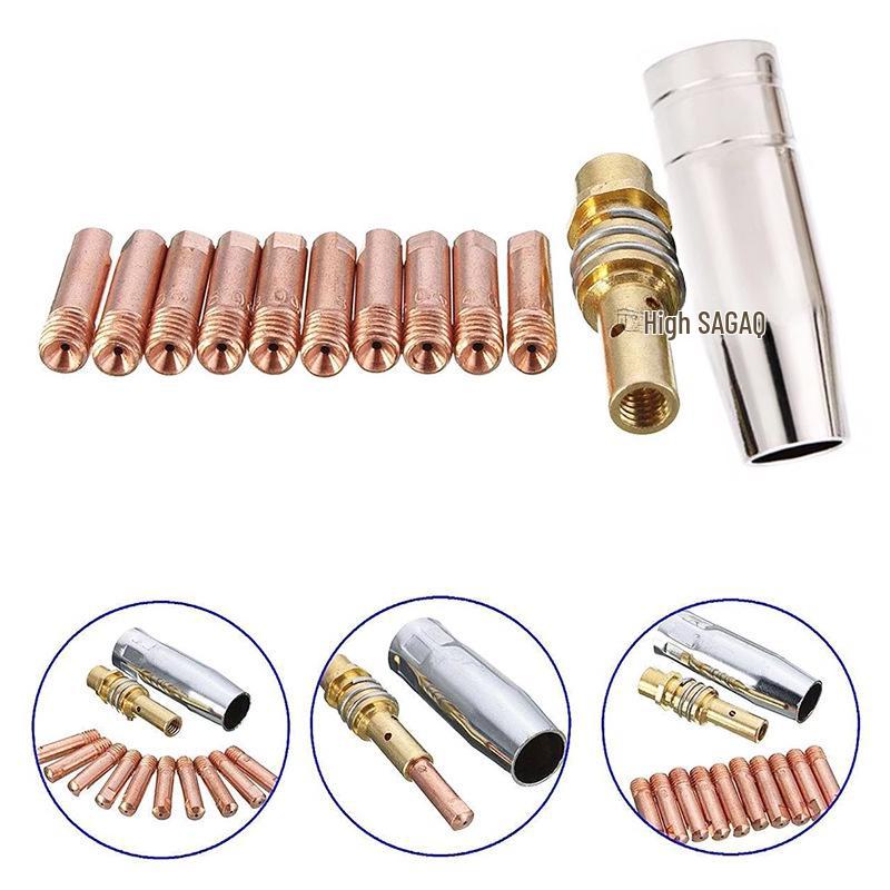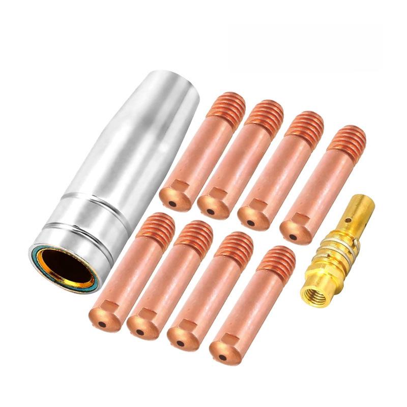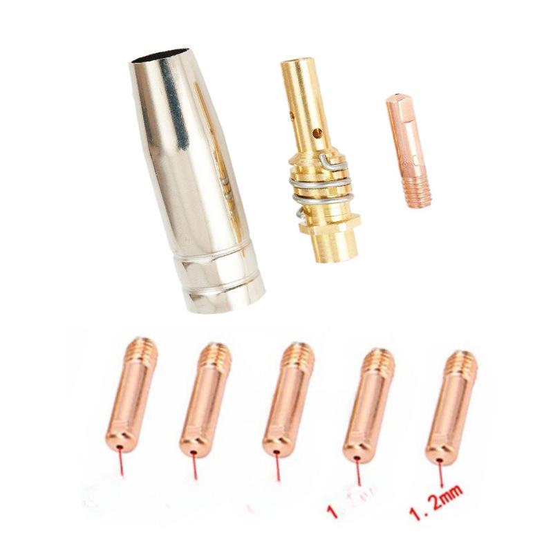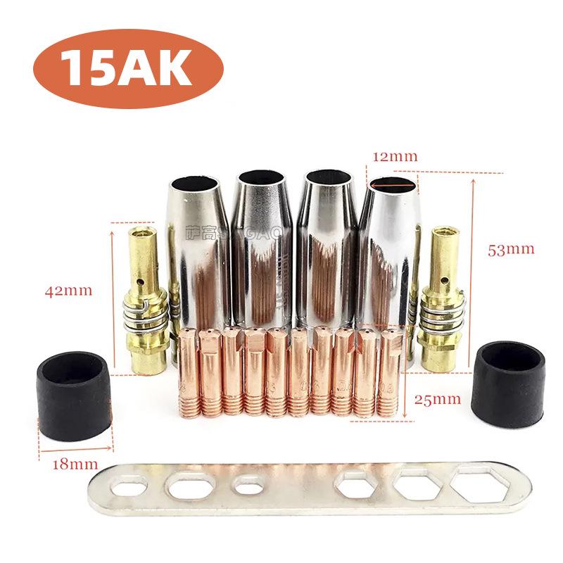 Аксессуары для сварочного пистолета с двойной защитой 15AK: 12 защитных и токопроводящих насадок.