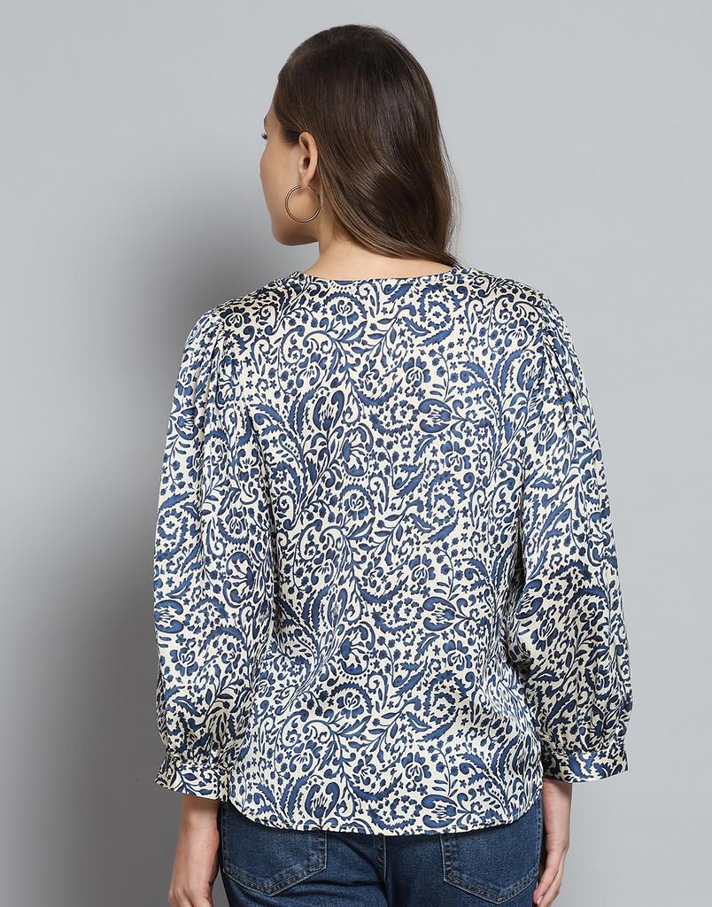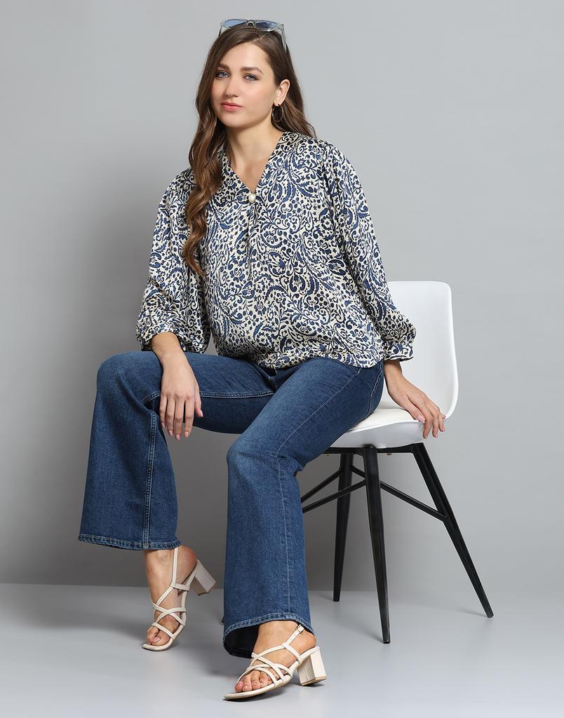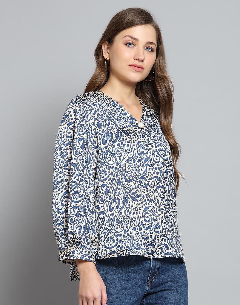 MONTE CARLO Женский топ с принтом, синий, с V-образным вырезом и рукавами полной длины
