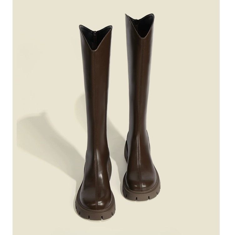 Ботинки с V-образным вырезом женские 2025 новые осенне-зимние сапоги с толстой подошвой высокие сапоги рыцарские сапоги бежевые на среднем каблуке