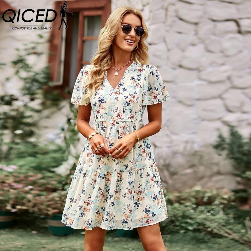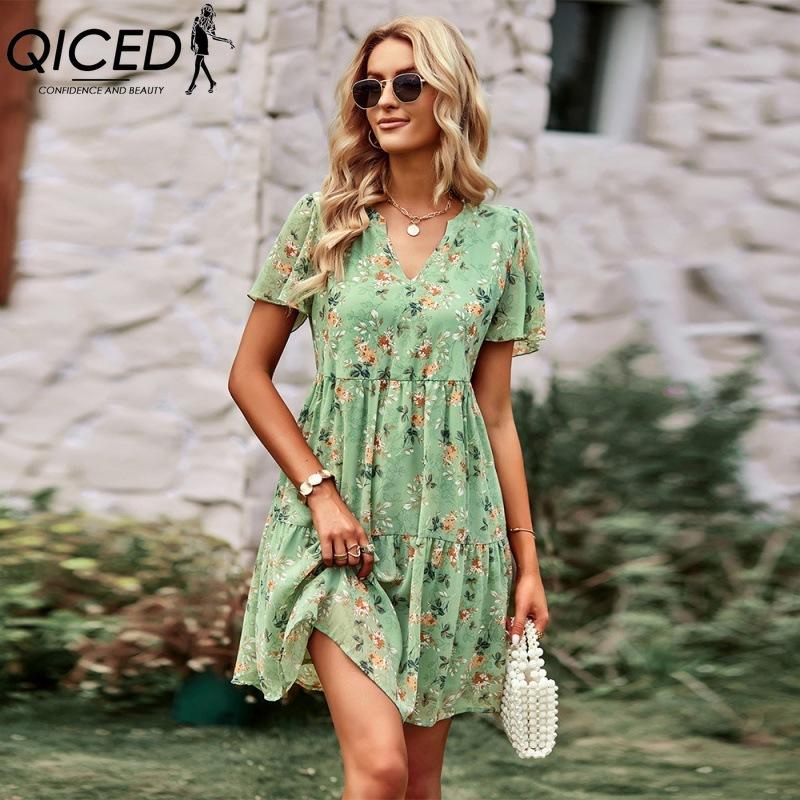 QICED Женская мода лето весна повседневные платья с коротким рукавом и v-образным вырезом