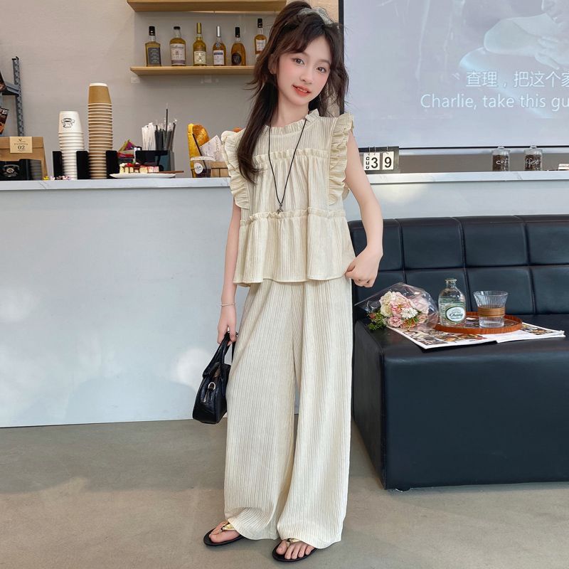 Одежда для девочек Летняя детская мода Топы и брюки с оборками Комплект из двух предметов Детский костюм без рукавов Наряды для девочек-подростков
