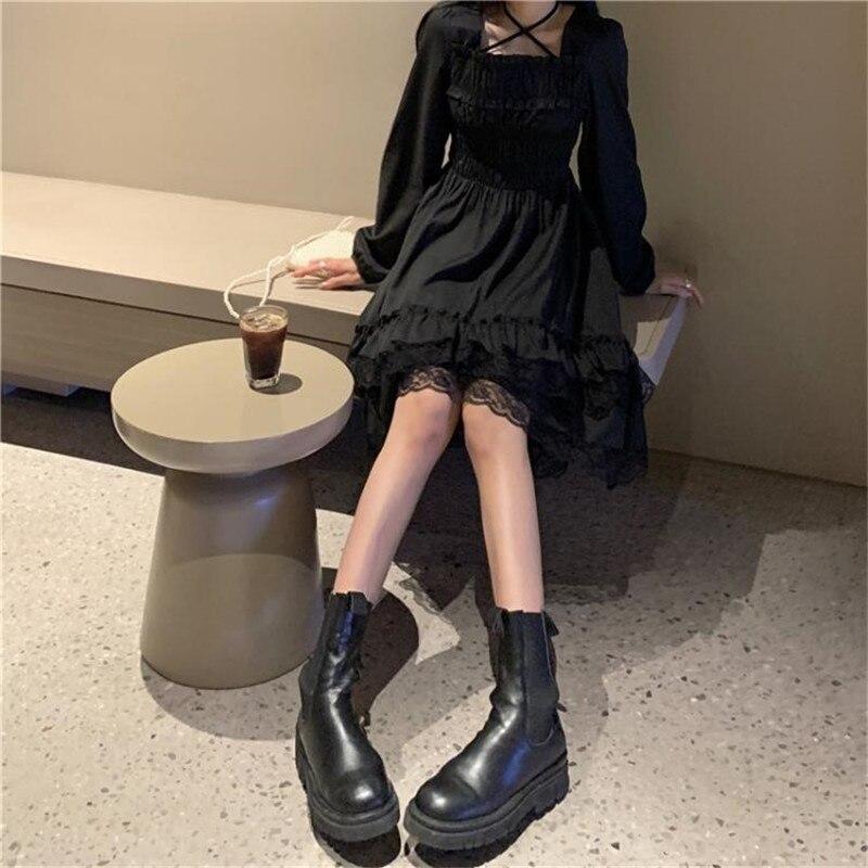 Новое готическое женское черное праздничное платье феи с квадратным воротником в стиле Лолиты, платье принцессы нестандартной формы, милое шикарное платье Kawaii с кружевными оборками