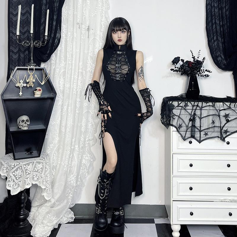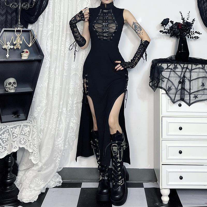 AltGoth Cyber Punk Gothic Dress Women Harajuku Dark Grunge Mesh Patchwork See Through Bandage Dress Without Sleeves Clubwear Female