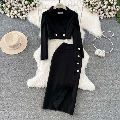 Женский новый модный весенне-осенний элегантный короткий пиджак, куртка + длинная юбка-карандаш с разрезом миди, комплект из двух предметов