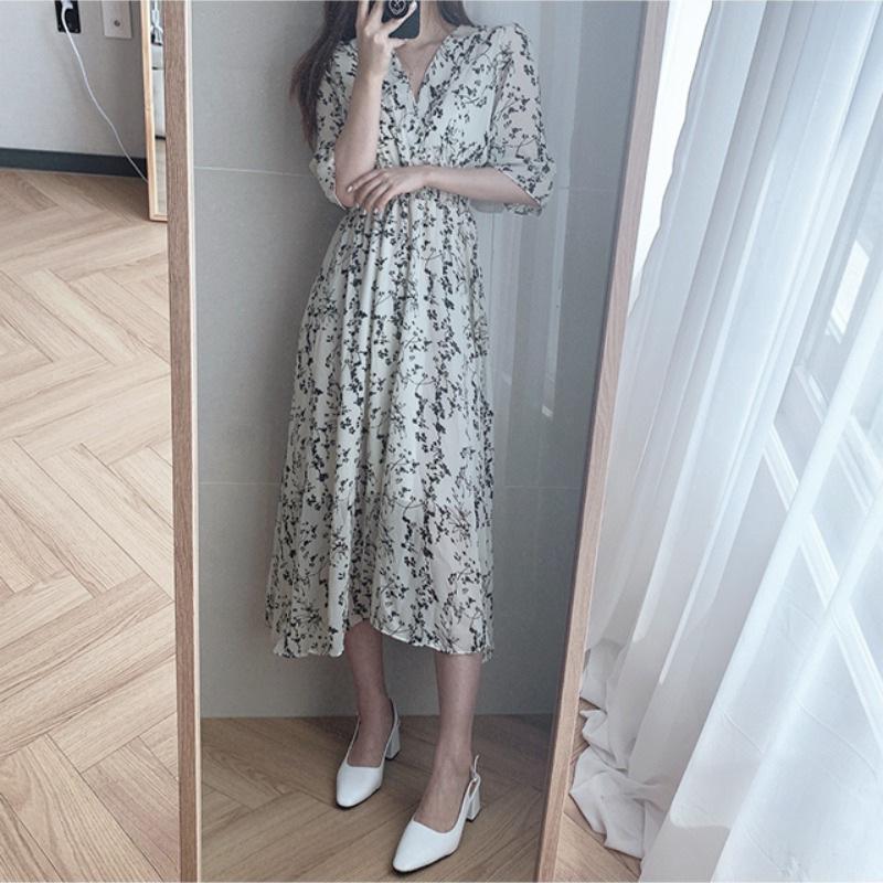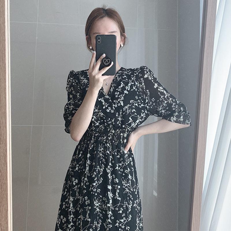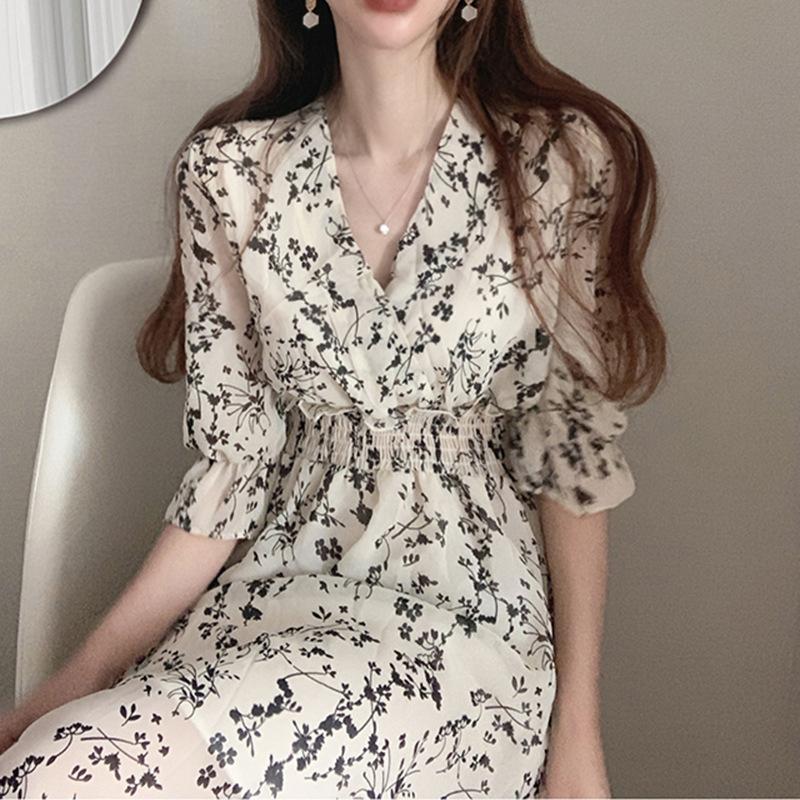 Новый стиль французского платикодонового ретро-облегающего талии темпераментного шифонового платья с V-образным вырезом и цветочным узором для женщин на лето