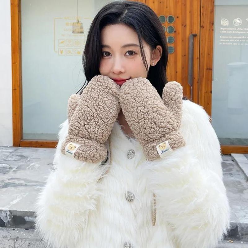 Kawaii плюшевые теплые перчатки, мягкие зимние толстые корейские японские перчатки без пальцев с медведем и веревками, повседневные уличные варежки для верховой езды, теплые