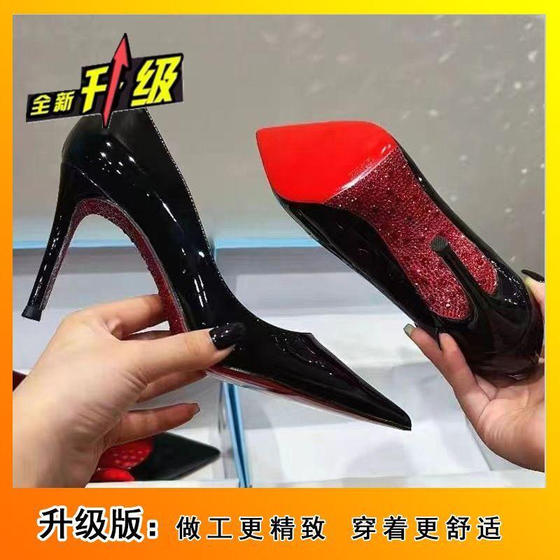 Туфли на высоком каблуке с красной подошвой и стразами, королевские, с тонким каблуком, с вырезом, мужские и женские, 2024 новинка, остроносые, из лакированной кожи, сексуальные черные туфли-лодочки, осень