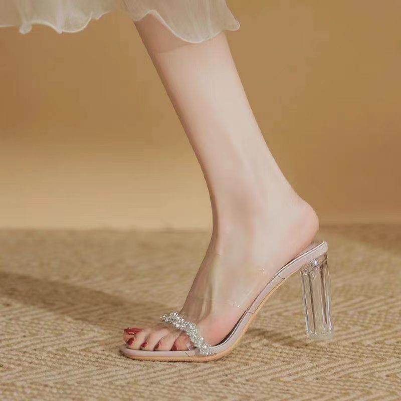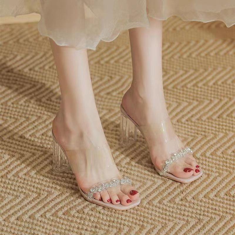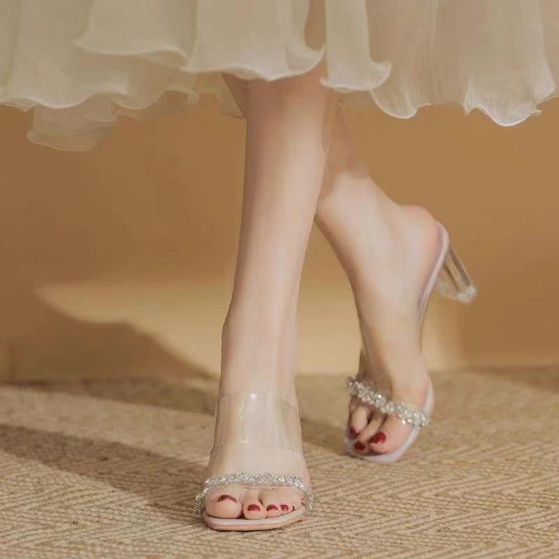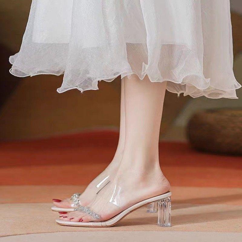 Одно слово с босоножками на высоком каблуке для женской новой весны 2024 года прозрачные хрустальные толстокаблучные уличные тапочки инс