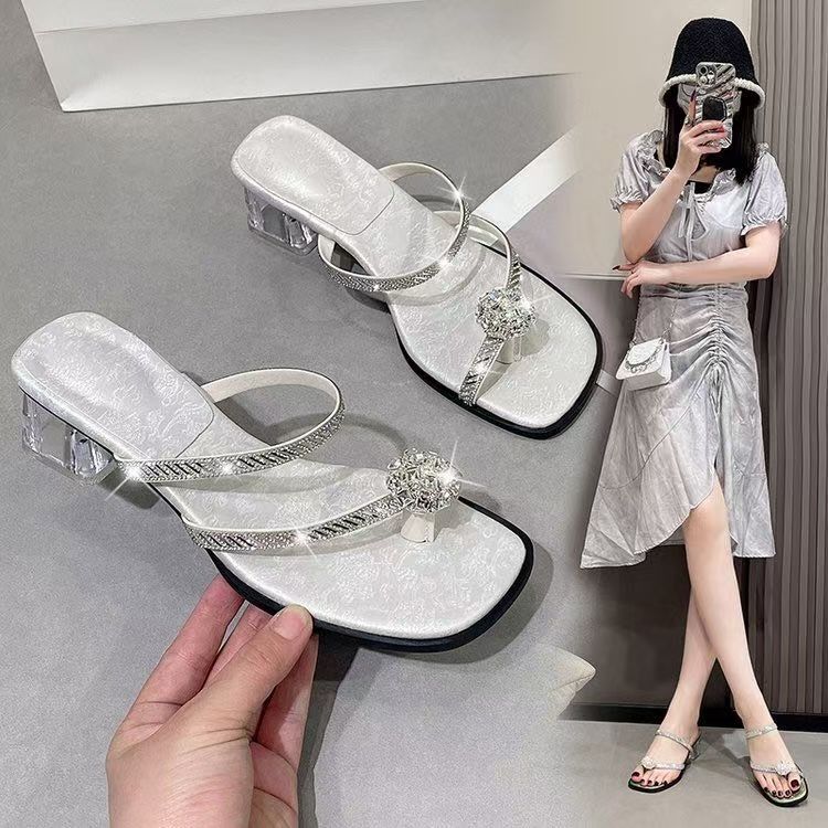 Крутые тапочки женские 2025 новые летние хрустальные с перемычкой между пальцами в национальном стиле на среднем каблуке с закрытым носком, универсальные тапочки на толстом каблуке со стразами