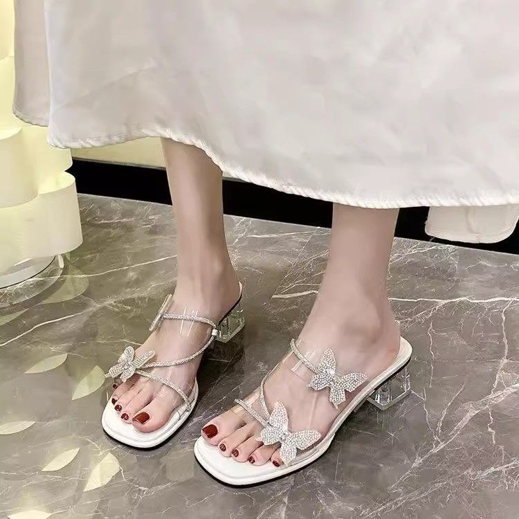 Красивые прохладные тапочки женские 2025 лето новые прозрачные темперамент бант стразы с юбкой высокий каблук фея сандалии