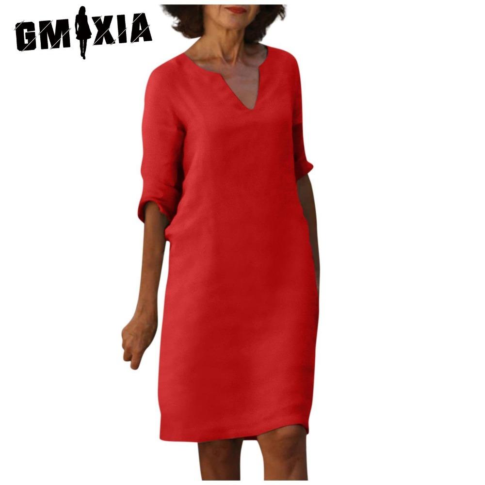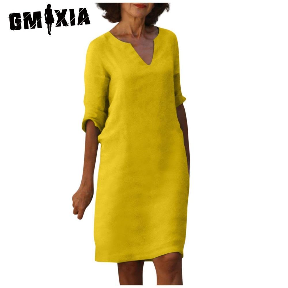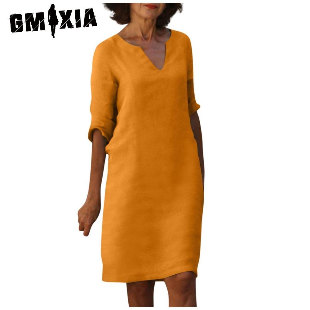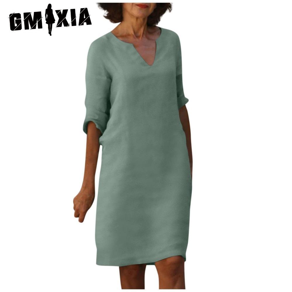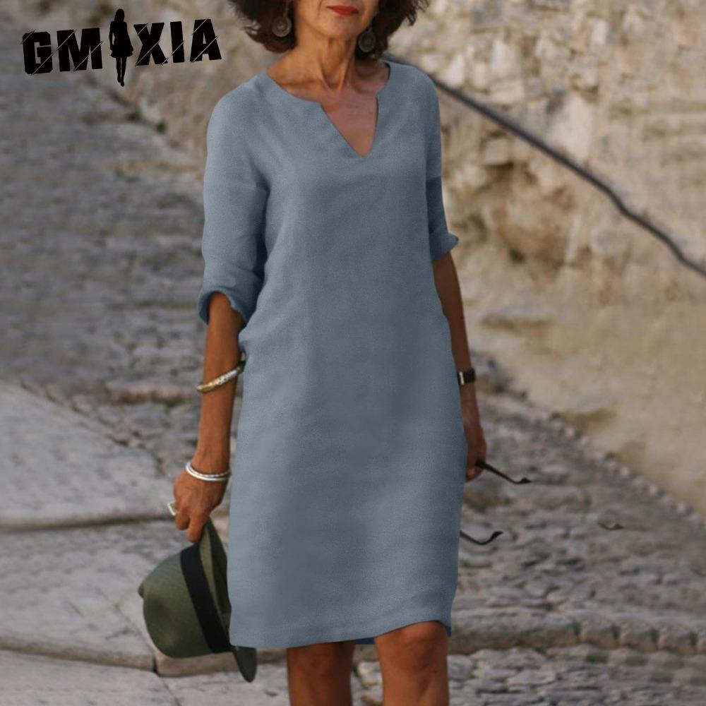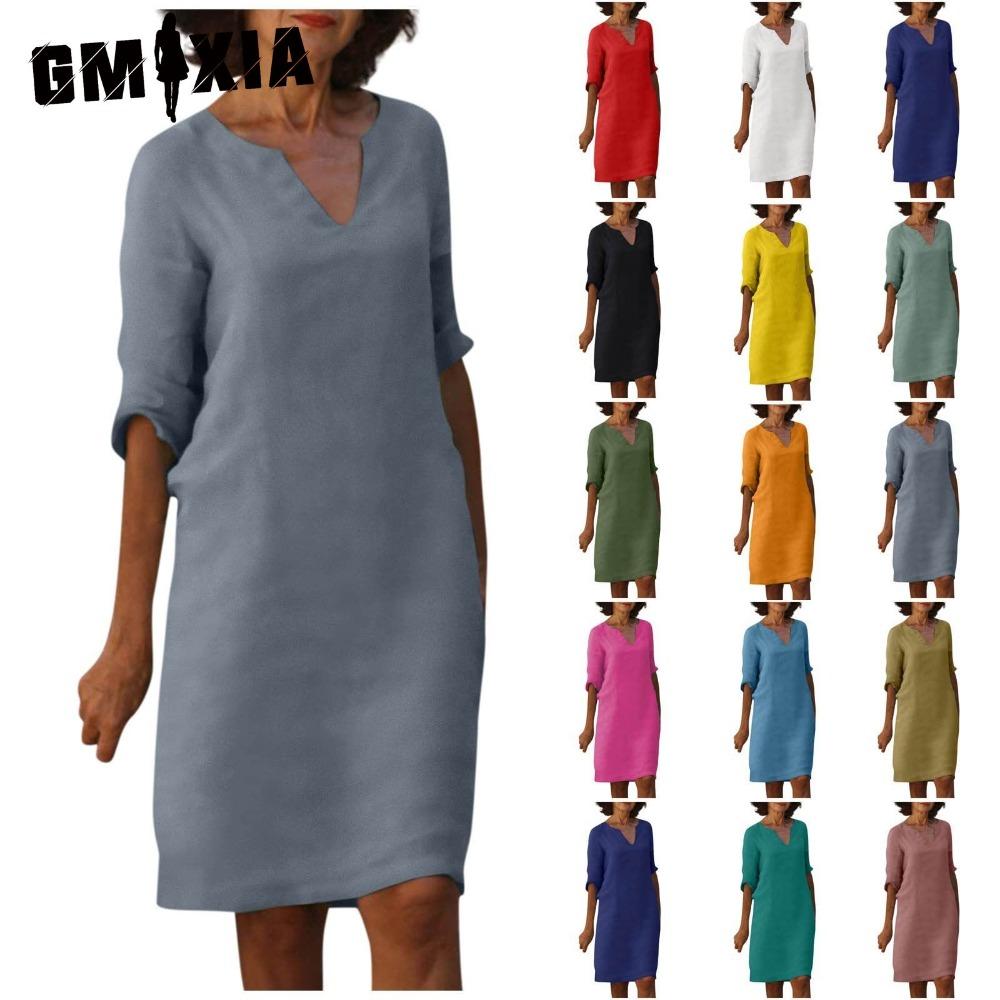 GMXIA Женское летнее однотонное хлопковое льняное ретро-платье с V-образным вырезом и коротким рукавом, легкое дышащее платье