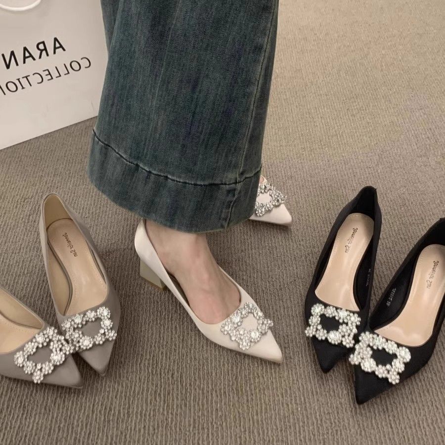 Новые французские туфли-лодочки на высоком толстом каблуке с квадратной пряжкой из стразов, женские 2025, шелковые, с острым носком, с открытым вырезом, свадебные туфли, одинарные туфли — купить товар онлайн с бесплатной доставкой до всему миру!