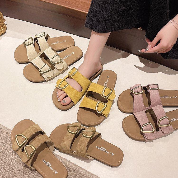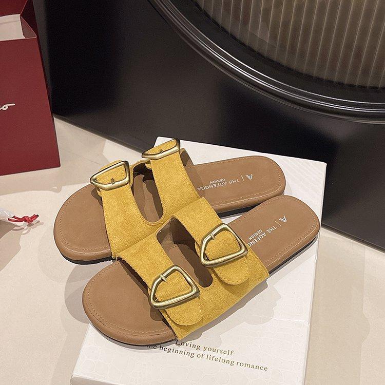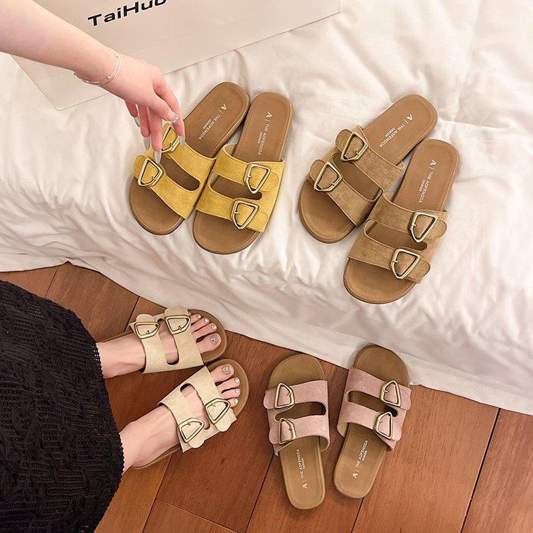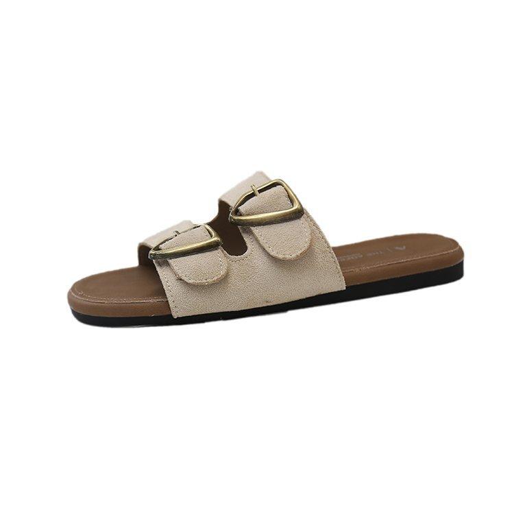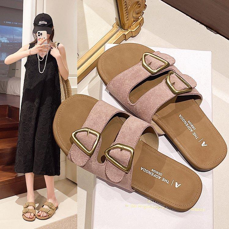 Slippers women's outer wear 2025 summer new fashion belt buckle seaside beach one-word flat-bottomed casual cool slippers