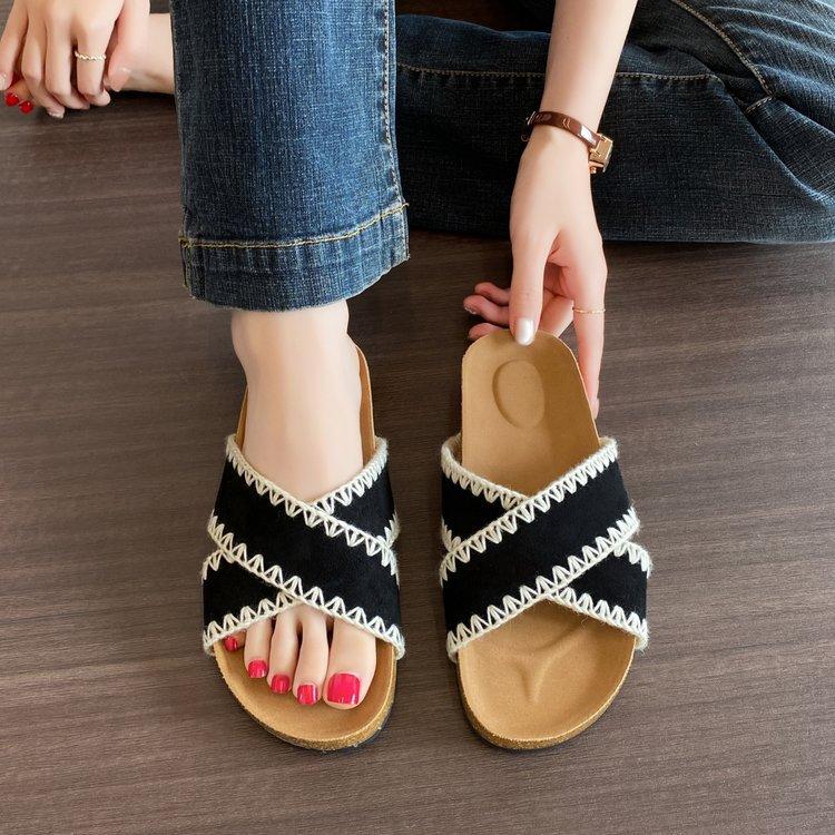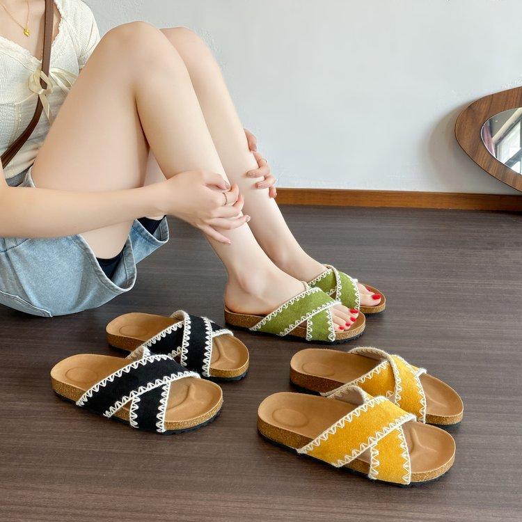 Large size slippers French retro style cross belt flat bottom cool slippers women's casual versatile beach cool slippers
