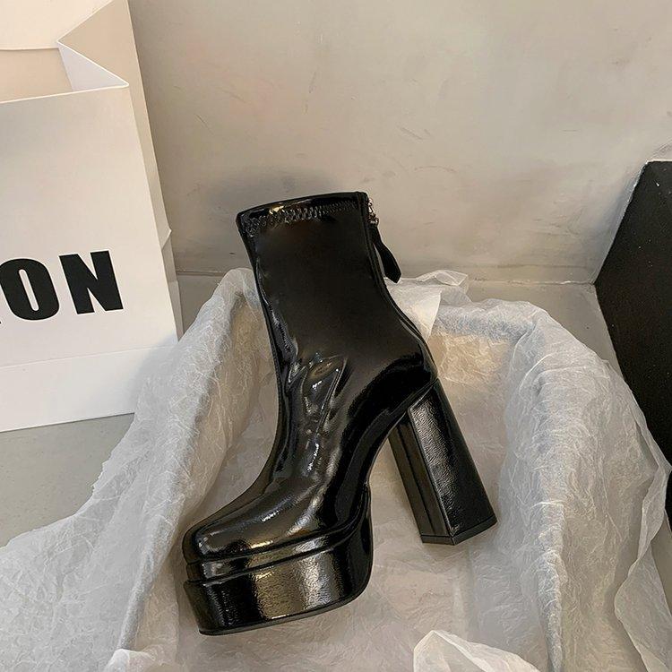 У женской группы такие же ботильоны на толстой подошве и толстом каблуке, как и осенью и зимой 2024 года, новые маленькие эластичные тонкие ботинки, супер высокий каблук из лакированной кожи