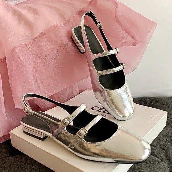 Туфли Мэри Джейн с двумя пряжками, серебристые, на плоской подошве, на низком каблуке, французские ретро-сандалии Baotou Backempty для женщин