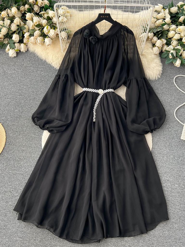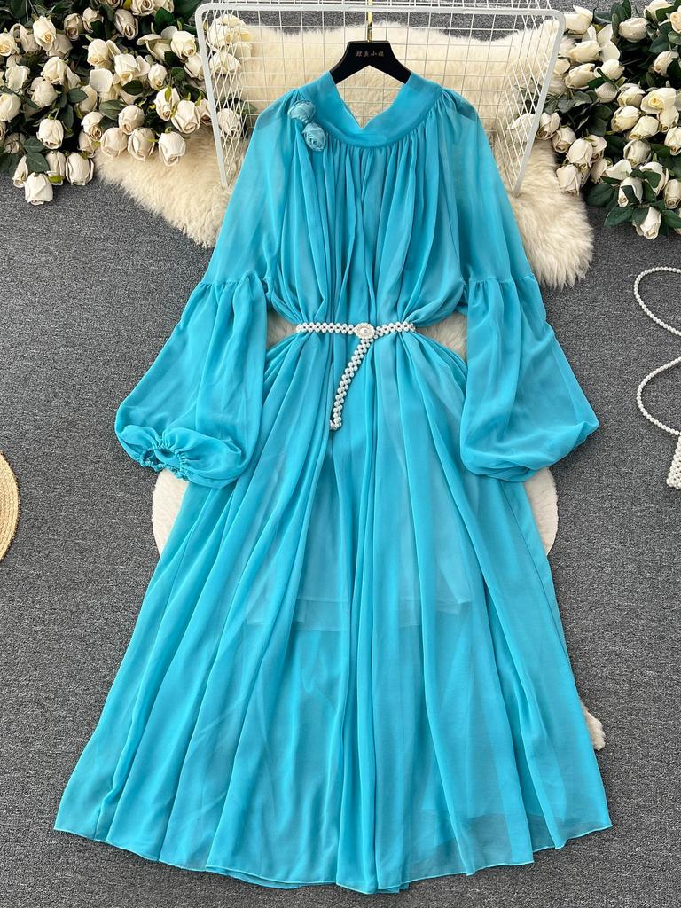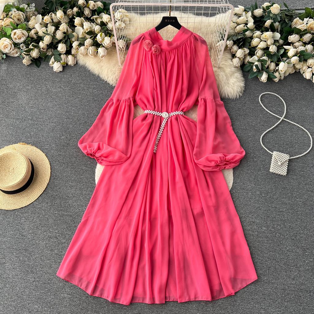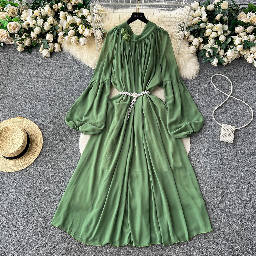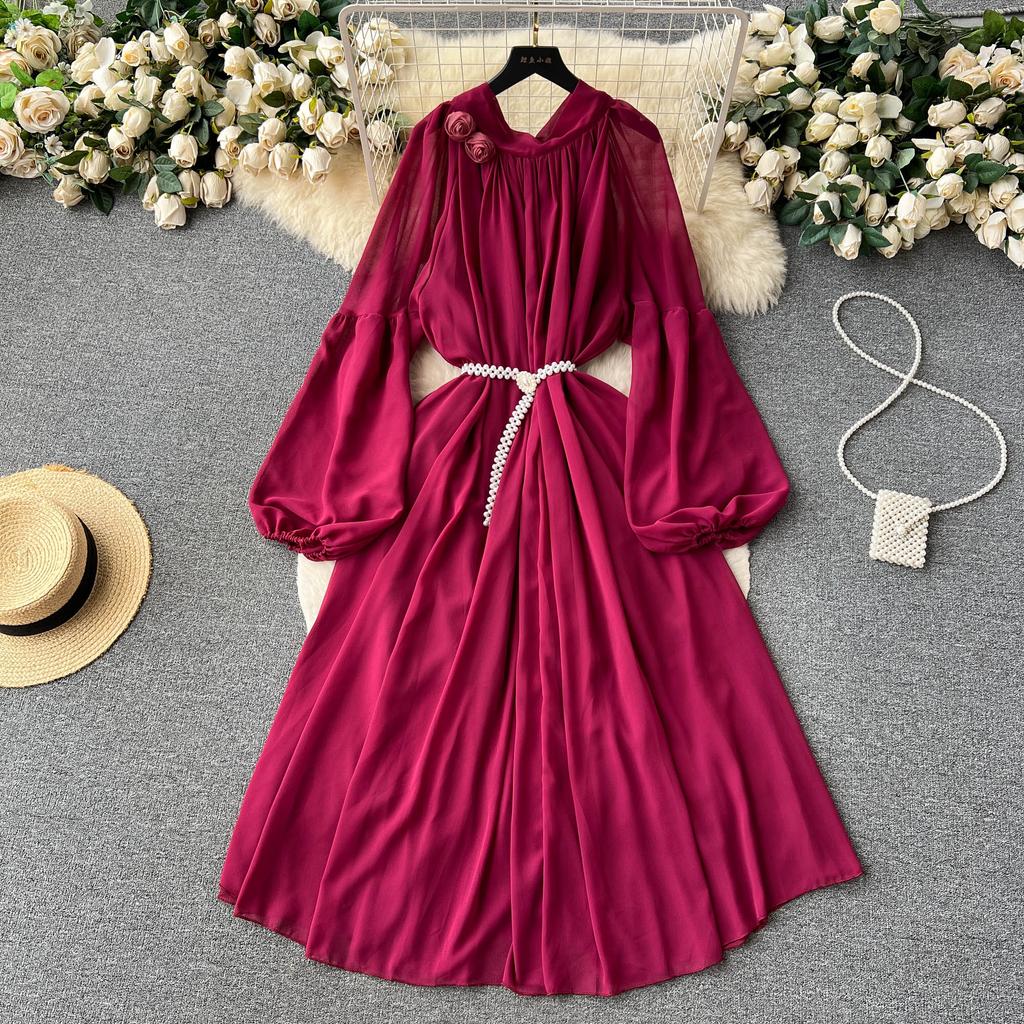 Роскошное шифоновое платье с жемчужным поясом, осеннее ретро-фонари с длинным рукавом, длинное вечернее платье с большими качелями, вечерние женские платья