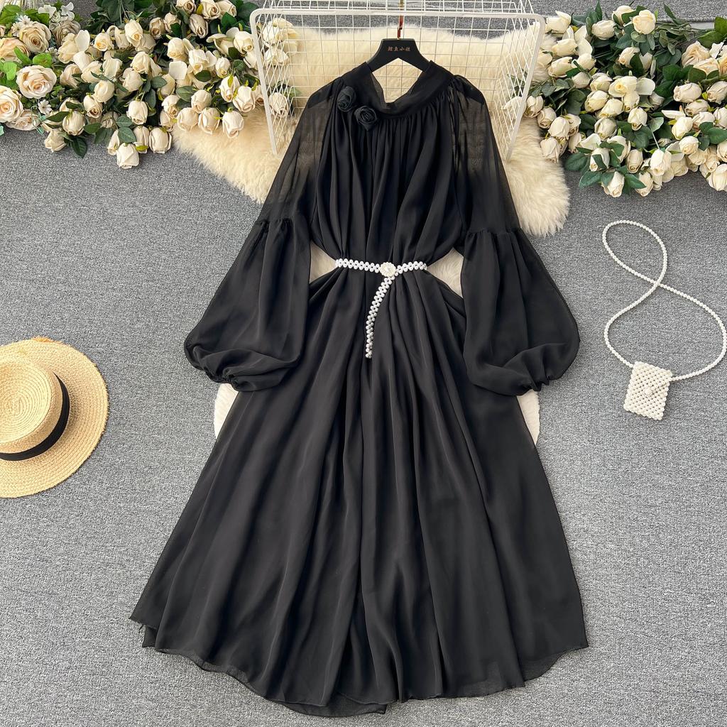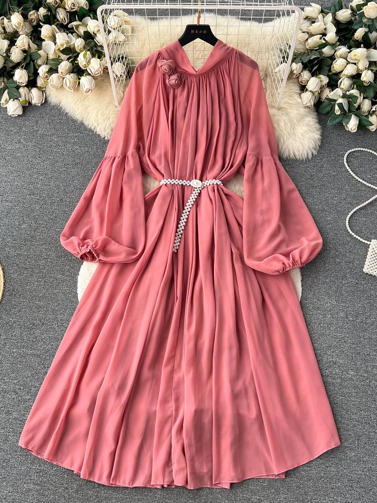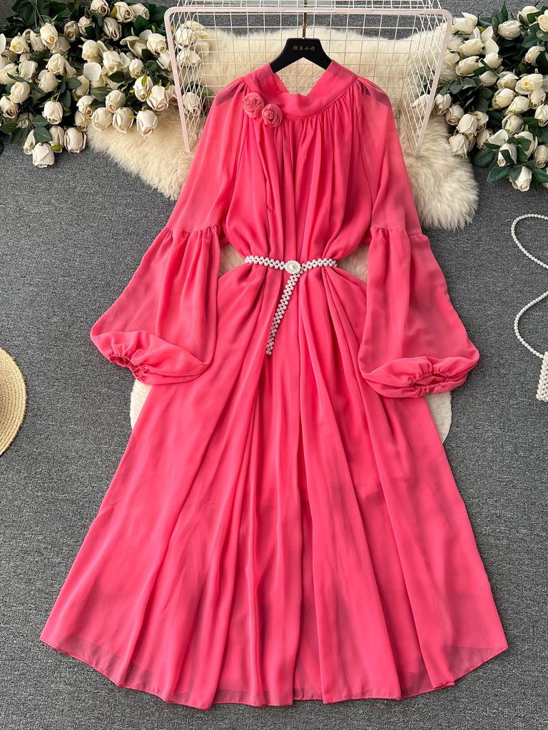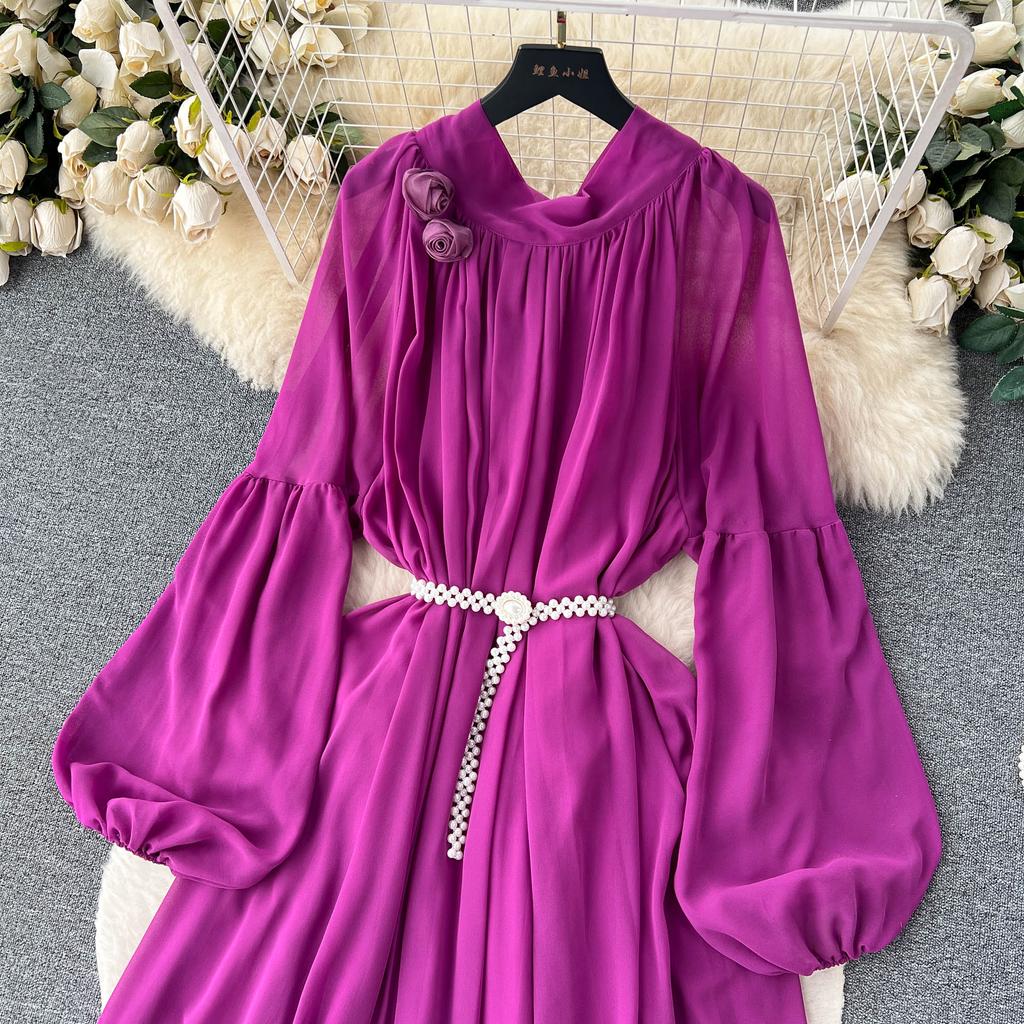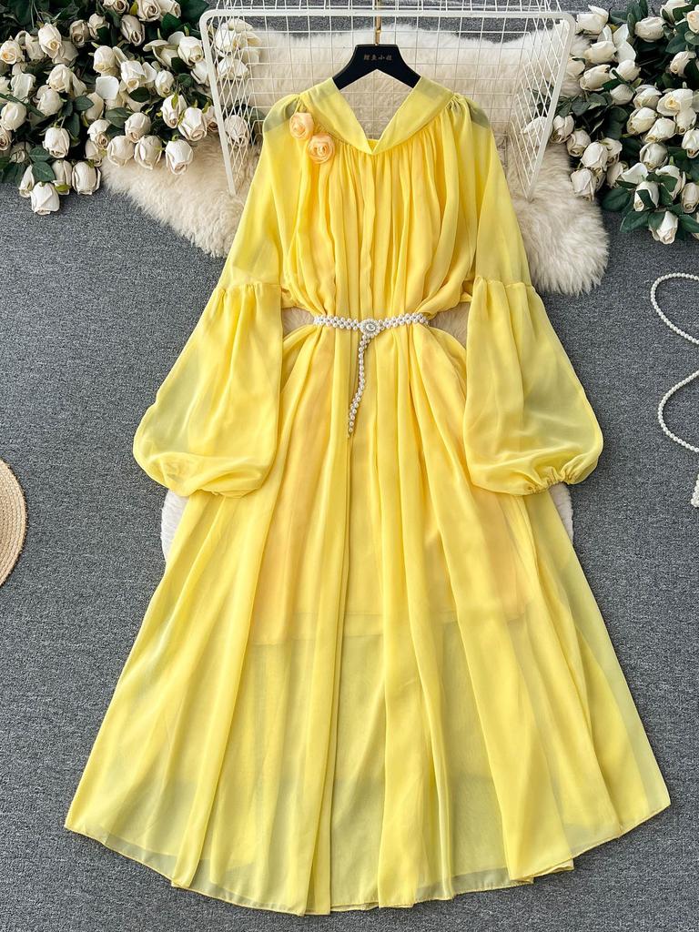 Роскошное шифоновое платье с жемчужным поясом, осеннее ретро-фонари с длинным рукавом, длинное вечернее платье с большими качелями, вечерние женские платья
